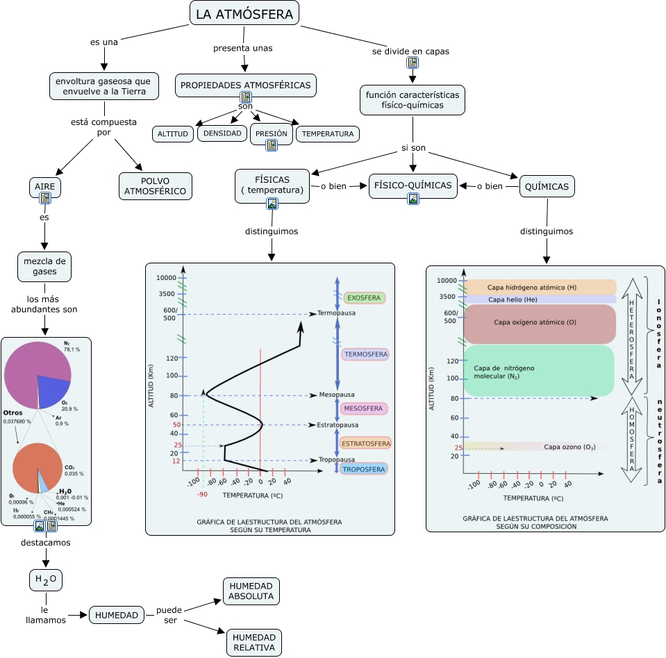 Este Cmap, tiene información relacionada con: 1 Composición y estructura de la atmósfera, PROPIEDADES ATMOSFÉRICAS son DENSIDAD, PROPIEDADES ATMOSFÉRICAS son ALTITUD, HUMEDAD puede ser HUMEDAD RELATIVA, LA ATMÓSFERA es una envoltura gaseosa que envuelve a la Tierra, <math xmlns="http://www.w3.org/1998/Math/MathML"> <mrow> <mmultiscripts> <mtext> H </mtext> <mtext> 2 </mtext> <none/> </mmultiscripts> <mtext> O </mtext> </mrow> </math> le llamamos HUMEDAD, QUÍMICAS distinguimos, FÍSICAS ( temperatura) distinguimos, FÍSICAS ( temperatura) o bien FÍSICO-QUÍMICAS, PROPIEDADES ATMOSFÉRICAS son PRESIÓN, función características físíco-químicas si son FÍSICAS ( temperatura), QUÍMICAS o bien FÍSICO-QUÍMICAS, LA ATMÓSFERA se divide en capas función características físíco-químicas, función características físíco-químicas si son QUÍMICAS, PROPIEDADES ATMOSFÉRICAS son TEMPERATURA, envoltura gaseosa que envuelve a la Tierra está compuesta por AIRE, función características físíco-químicas si son FÍSICO-QUÍMICAS, HUMEDAD puede ser HUMEDAD ABSOLUTA, LA ATMÓSFERA presenta unas PROPIEDADES ATMOSFÉRICAS, envoltura gaseosa que envuelve a la Tierra está compuesta por POLVO ATMOSFÉRICO, destacamos <math xmlns="http://www.w3.org/1998/Math/MathML"> <mrow> <mmultiscripts> <mtext> H </mtext> <mtext> 2 </mtext> <none/> </mmultiscripts> <mtext> O </mtext> </mrow> </math>