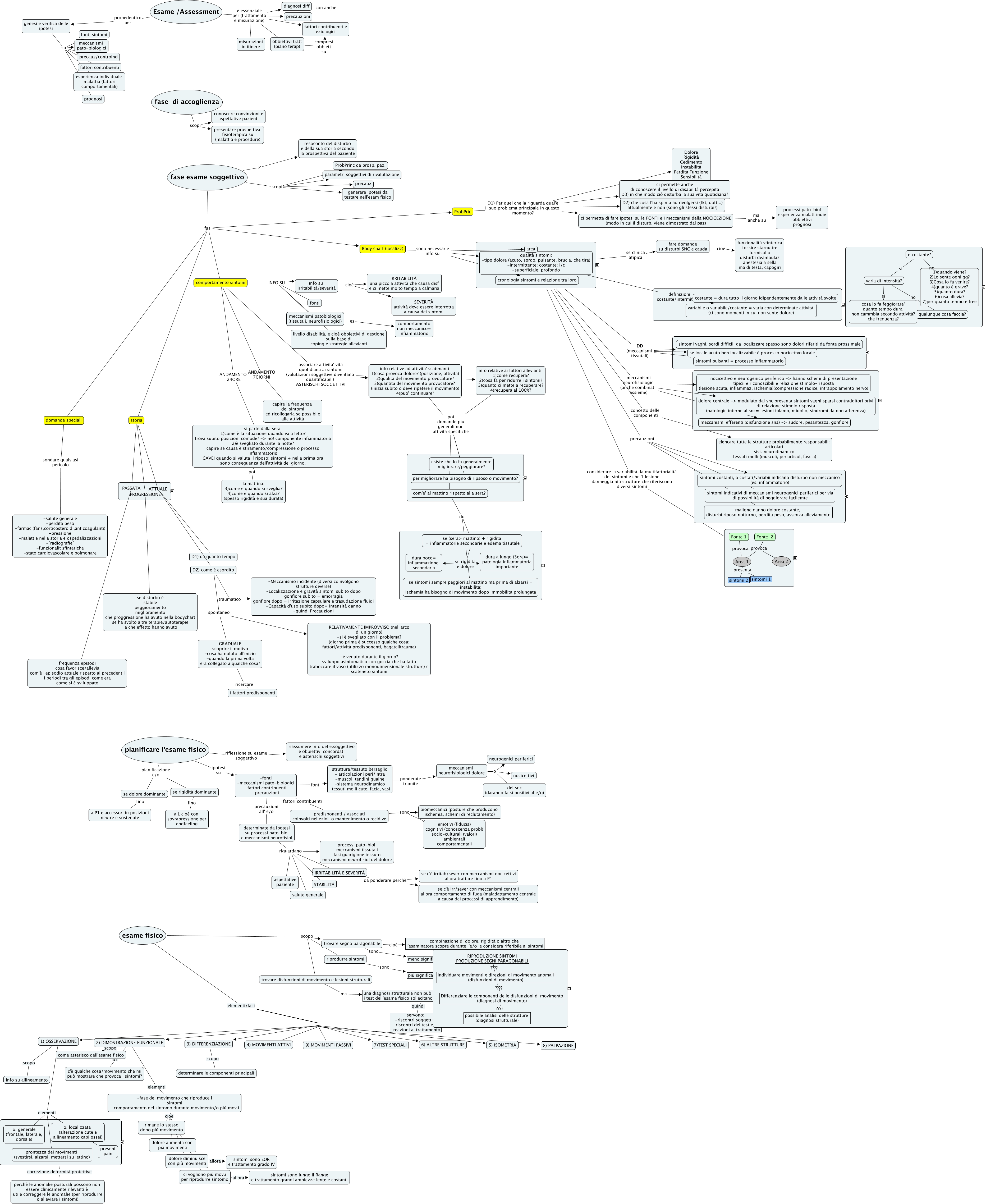 Questa Cmap, creata con IHMC CmapTools, contiene informazioni relative a: MAITLAND assessment teoria, -fase del movimento che riproduce i sintomi - comportamento del sintomo durante movimento/o più mov.i cioè ci vogliono più mov.i per riprodurre sintomo, esame fisico elementi/fasi 4) MOVIMENTI ATTIVI, pianificare l'esame fisico ipotesi su -fonti -meccanismi pato-biologici -fattori contribuenti -precauzioni, IRRITABILITÀ E SEVERITÀ da ponderare perchè se c'è irritab/sever con meccanismi nocicettivi allora trattare fino a P1, Differenziare le componenti delle disfunzioni di movimento (diagnosi di movimento) ???? possibile analisi delle strutture (diagnosi strutturale), determinate da ipotesi su processi pato-biol e meccanismi neurofisiol riguardano aspettative paziente, fase esame soggettivo e' resoconto del disturbo e della sua storia secondo la prospettiva del paziente, ???? se clinica atipica fare domande su disturbi SNC e cauda, ???? meccanismi neurofisiologici (anche combinati assieme) dolore centrale -> modulato dal snc presenta sintomi vaghi sparsi contradditori privi di relazione stimolo risposta (patologie interne al snc= lesioni talamo, midollo, sindromi da non afferenza), fase esame soggettivo fasi comportamento sintomi, com'e' al mattino rispetto alla sera? dd se sintomi sempre peggiori al mattino ma prima di alzarsi = instabilita; ischemia ha bisogno di movimento dopo immobilita prolungata, ???? DD (meccanismi tissutali) sintomi vaghi, sordi difficili da localizzare spesso sono dolori riferiti da fonte prossimale, fase esame soggettivo fasi ProbPric, obbiettivi tratt (piano terap) compresi obbiett su fattori contribuenti e eziologici, GRADUALE scoprire il motivo -cosa ha notato all'inizio -quando la prima volta era collegato a qualche cosa? ricercare i fattori predisponenti, qualità sintomi: -tipo dolore (acuto, sordo, pulsante, brucia, che tira) -intermittente; costante; i/c -superficiale; profondo definizioni costante/intermittente costante = dura tutto il giorno idipendentemente dalle attività svolte, predisponenti / associati coinvolti nel eziol. o mantenimento o recidive sono biomeccanici (posture che producono ischemia, schemi di reclutamento), ???? precauzioni maligne danno dolore costante, disturbi riposo notturno, perdita peso, assenza alleviamento, info relative ad attivita' scatenanti: 1)cosa provoca dolore? (posizione, attivita) 2)qualita del movimento provocatore? 3)quantita del movimento provocatore? (inizia subito o deve ripetere il movimento) 4)puo' continuare? poi domande piu generali non attivita specifiche per migliorare ha bisogno di ripsoso o movimento?, ???? DD (meccanismi tissutali) sintomi pulsanti = processo infiammatorio