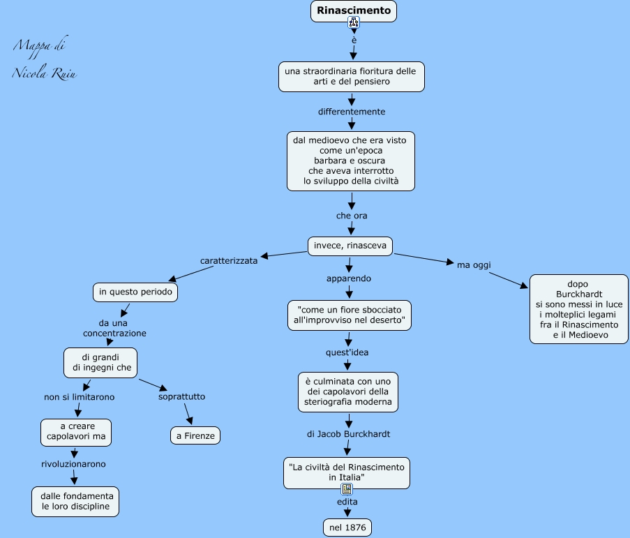 Questa Cmap, creata con IHMC CmapTools, contiene informazioni relative a: Rinascimento, Rinascimento è una straordinaria fioritura delle arti e del pensiero, a creare capolavori ma rivoluzionarono dalle fondamenta le loro discipline, invece, rinasceva ma oggi dopo Burckhardt si sono messi in luce i molteplici legami fra il Rinascimento e il Medioevo, una straordinaria fioritura delle arti e del pensiero differentemente dal medioevo che era visto come un'epoca barbara e oscura che aveva interrotto lo sviluppo della civiltà, dal medioevo che era visto come un'epoca barbara e oscura che aveva interrotto lo sviluppo della civiltà che ora invece, rinasceva, invece, rinasceva caratterizzata in questo periodo, è culminata con uno dei capolavori della steriografia moderna di Jacob Burckhardt "La civiltà del Rinascimento in Italia", "come un fiore sbocciato all'improvviso nel deserto" quest'idea è culminata con uno dei capolavori della steriografia moderna, di grandi di ingegni che soprattutto a Firenze, di grandi di ingegni che non si limitarono a creare capolavori ma, in questo periodo da una concentrazione di grandi di ingegni che, invece, rinasceva apparendo "come un fiore sbocciato all'improvviso nel deserto", "La civiltà del Rinascimento in Italia" edita nel 1876