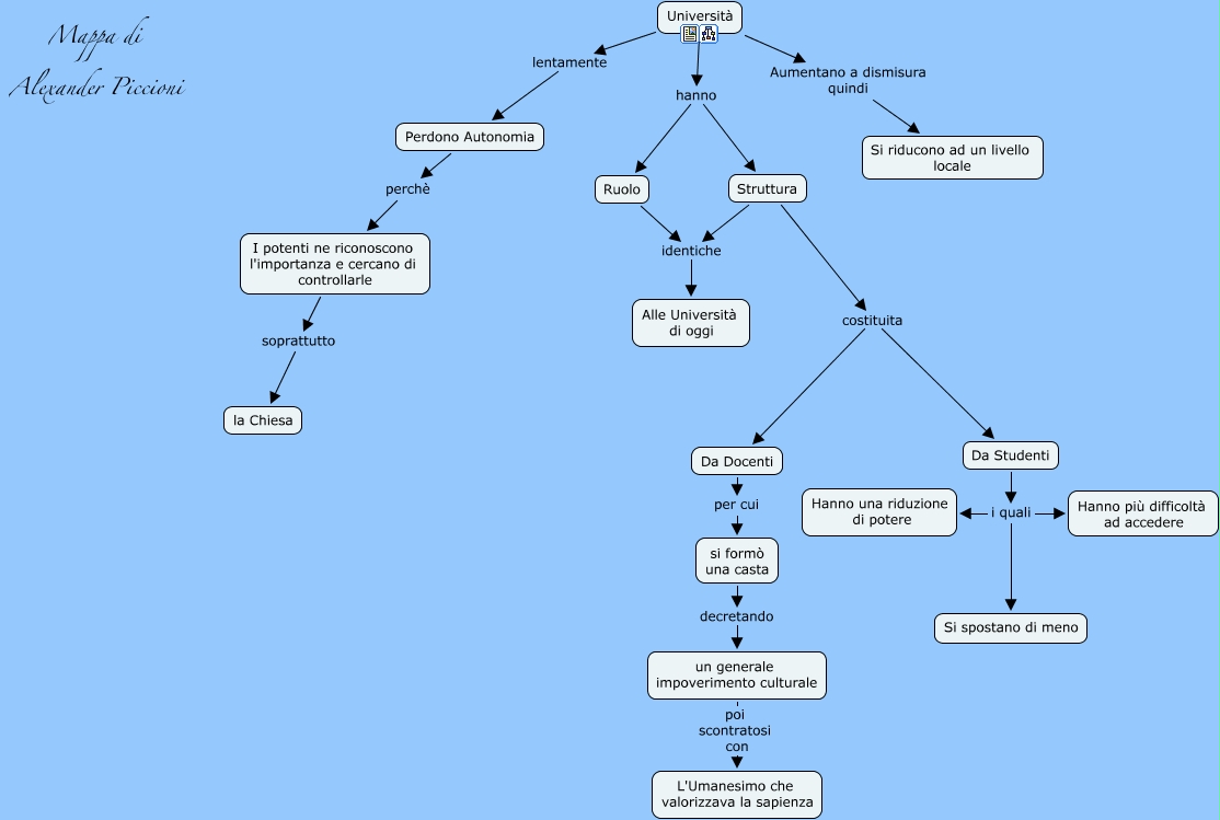 Questa Cmap, creata con IHMC CmapTools, contiene informazioni relative a: Luoghi Università, Da Studenti i quali Hanno più difficoltà ad accedere, Perdono Autonomia perchè I potenti ne riconoscono l'importanza e cercano di controllarle, Struttura costituita Da Studenti, Struttura identiche Alle Università di oggi, Università lentamente Perdono Autonomia, Da Studenti i quali Hanno una riduzione di potere, I potenti ne riconoscono l'importanza e cercano di controllarle soprattutto la Chiesa, Università hanno Ruolo, Da Docenti per cui si formò una casta, Da Studenti i quali Si spostano di meno, Struttura costituita Da Docenti, si formò una casta decretando un generale impoverimento culturale, Ruolo identiche Alle Università di oggi, un generale impoverimento culturale poi scontratosi con L'Umanesimo che valorizzava la sapienza, Università Aumentano a dismisura quindi Si riducono ad un livello locale, Università hanno Struttura