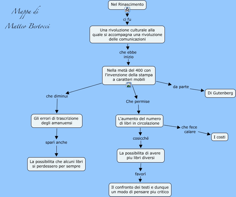 Questa Cmap, creata con IHMC CmapTools, contiene informazioni relative a: rivoluzione delle comunicazioni, L'aumento del numero di libri in circolazione che fece calare I costi, Nel Rinascimento ci fu Una rivoluzione culturale alla quale si accompagna una rivoluzione delle comunicazioni, Gli errori di trascrizione degli amanuensi sparì anche La possibilita che alcuni libri si perdessero per sempre, La possibilita di avere piu libri diversi favorì Il confronto dei testi e dunque un modo di pensare piu critico, Una rivoluzione culturale alla quale si accompagna una rivoluzione delle comunicazioni che ebbe inizio Nella metà del 400 con l'invenzione della stampa a caratteri mobili, Nella metà del 400 con l'invenzione della stampa a caratteri mobili Che permise L'aumento del numero di libri in circolazione, Nella metà del 400 con l'invenzione della stampa a caratteri mobili da parte Di Gutenberg, Nella metà del 400 con l'invenzione della stampa a caratteri mobili che diminui Gli errori di trascrizione degli amanuensi, L'aumento del numero di libri in circolazione cosicché La possibilita di avere piu libri diversi