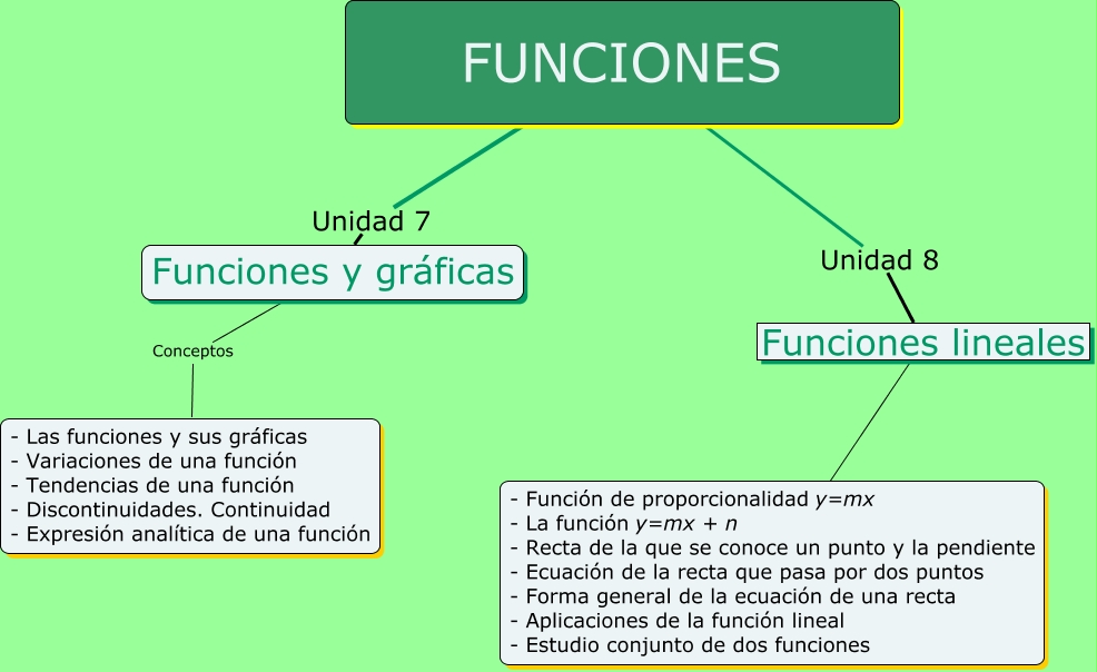 Este Cmap, tiene información relacionada con: funcionesESO.cmap.cmap, Funciones lineales Conceptos - Función de proporcionalidad y=mx - La función y=mx + n - Recta de la que se conoce un punto y la pendiente - Ecuación de la recta que pasa por dos puntos - Forma general de la ecuación de una recta - Aplicaciones de la función lineal - Estudio conjunto de dos funciones, FUNCIONES Unidad 7 Funciones y gráficas, FUNCIONES Unidad 8 Funciones lineales, Funciones y gráficas Conceptos - Las funciones y sus gráficas - Variaciones de una función - Tendencias de una función - Discontinuidades. Continuidad - Expresión analítica de una función
