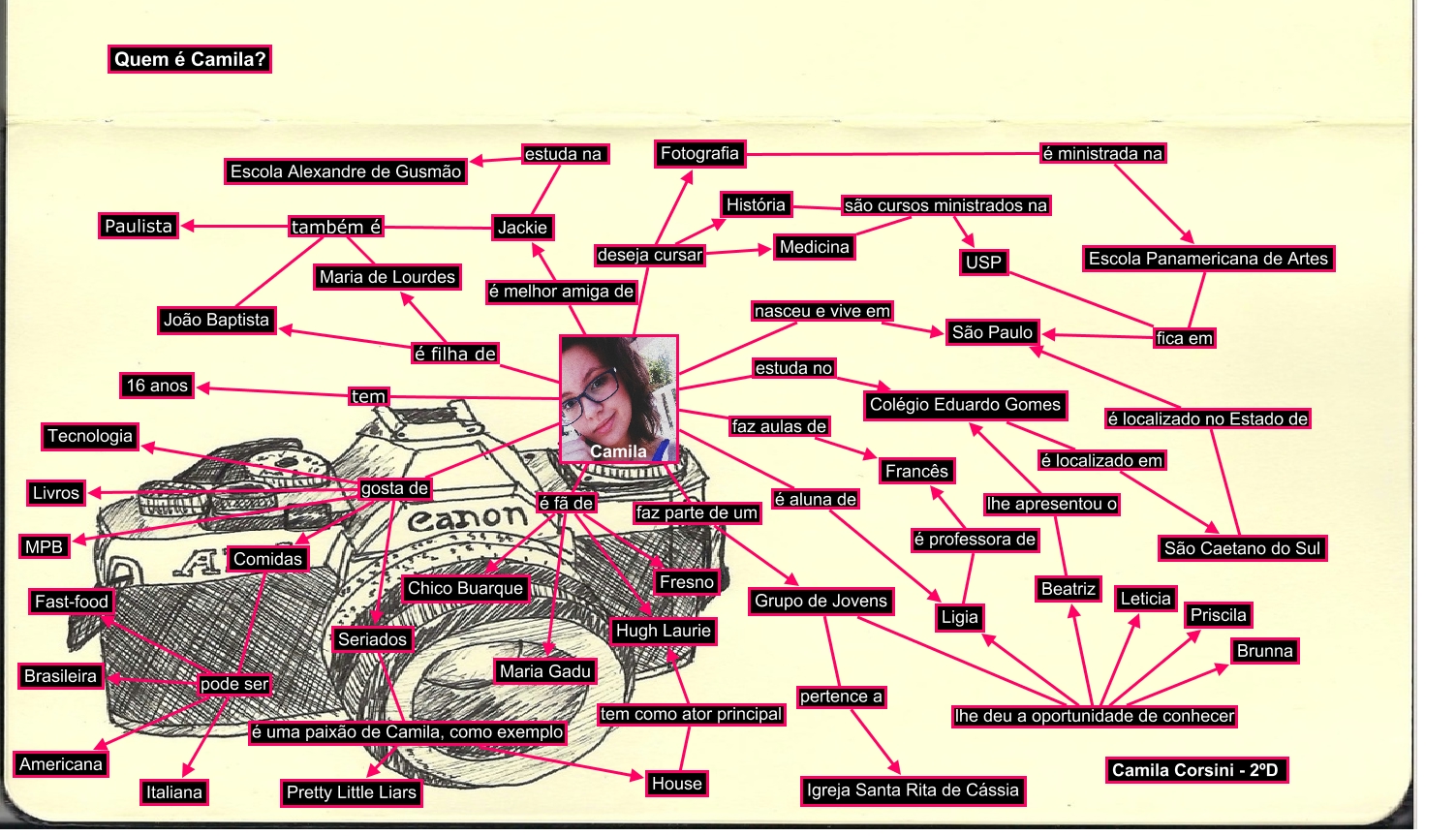 Esse mapa conceitual, produzido no IHMC CmapTools, tem a informação relacionada a: Quem é Camila Corsini, Jackie estuda na Escola Alexandre de Gusmão, House tem como ator principal Hugh Laurie, Medicina são cursos ministrados na USP, Grupo de Jovens lhe deu a oportunidade de conhecer Beatriz, Comidas pode ser Fast-food, Comidas pode ser Americana, Colégio Eduardo Gomes é localizado em São Caetano do Sul, Grupo de Jovens lhe deu a oportunidade de conhecer Priscila, Camila faz parte de um Grupo de Jovens, Jackie também é Paulista, Camila gosta de Tecnologia, Grupo de Jovens lhe deu a oportunidade de conhecer Brunna, Seriados é uma paixão de Camila, como exemplo Pretty Little Liars, Grupo de Jovens lhe deu a oportunidade de conhecer Leticia, USP fica em São Paulo, Camila nasceu e vive em São Paulo, Camila gosta de Seriados, Camila é filha de Maria de Lourdes, Camila é filha de João Baptista, Grupo de Jovens lhe deu a oportunidade de conhecer Ligia