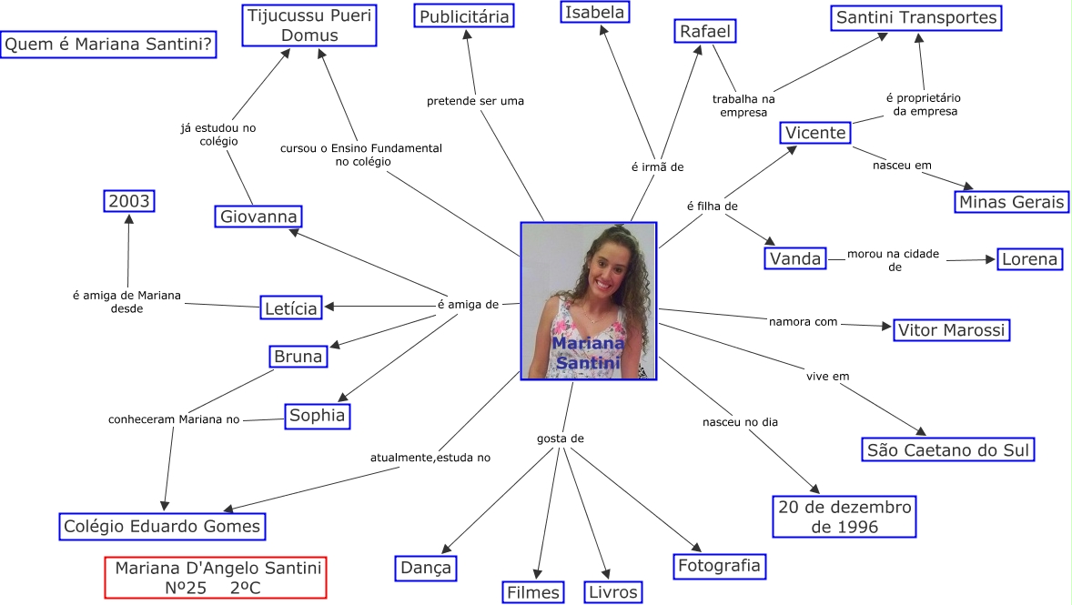 Esse mapa conceitual, produzido no IHMC CmapTools, tem a informação relacionada a: Mariana Santini, Mariana Santini é amiga de Letícia, Mariana Santini é amiga de Sophia, Mariana Santini vive em São Caetano do Sul, Rafael trabalha na empresa Santini Transportes, Mariana Santini é irmã de Rafael, Giovanna já estudou no colégio Tijucussu Pueri Domus, Vicente nasceu em Minas Gerais, Mariana Santini atualmente,estuda no Colégio Eduardo Gomes, Mariana Santini gosta de Fotografia, Sophia conheceram Mariana no Colégio Eduardo Gomes, Mariana Santini namora com Vitor Marossi, Mariana Santini cursou o Ensino Fundamental no colégio Tijucussu Pueri Domus, Mariana Santini gosta de Filmes, Mariana Santini é amiga de Bruna, Mariana Santini é filha de Vanda, Vicente é proprietário da empresa Santini Transportes, Mariana Santini gosta de Livros, Vanda morou na cidade de Lorena, Mariana Santini é amiga de Giovanna, Bruna conheceram Mariana no Colégio Eduardo Gomes