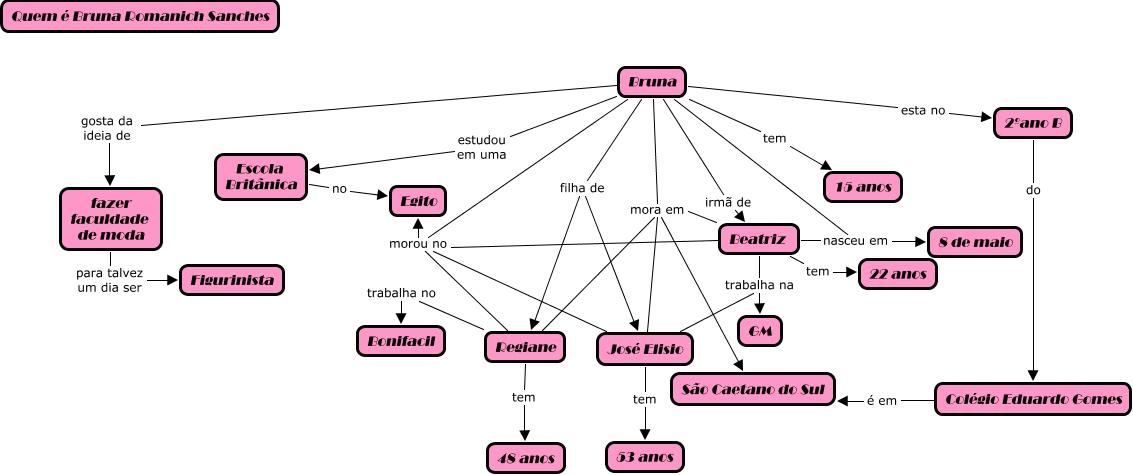 Esse mapa conceitual, produzido no IHMC CmapTools, tem a informação relacionada a: Sem título 1, fazer faculdade de moda para talvez um dia ser Figurinista, Bruna filha de Regiane, Regiane trabalha no Bonifacil, Beatriz mora em São Caetano do Sul, Regiane morou no Egito, 2ºano B do Colégio Eduardo Gomes, José Elisio morou no Egito, José Elisio trabalha na GM, Colégio Eduardo Gomes é em São Caetano do Sul, Regiane mora em São Caetano do Sul, Bruna esta no 2ºano B, José Elisio mora em São Caetano do Sul, Beatriz nasceu em 8 de maio, Regiane tem 48 anos, Beatriz tem 22 anos, Bruna tem 15 anos, Bruna gosta da ideia de fazer faculdade de moda, Bruna estudou em uma Escola Britânica, Bruna filha de José Elisio, Bruna nasceu em 8 de maio