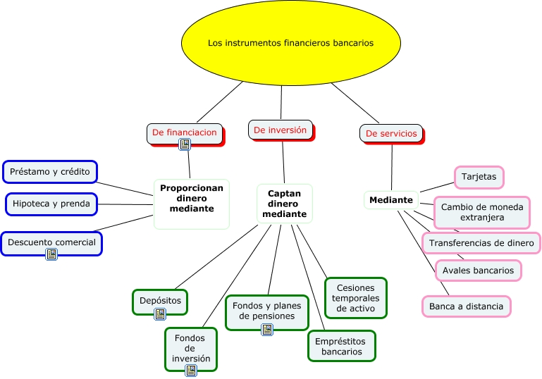 Este Cmap, tiene información relacionada con: instrumentos financieros bancarios, Los instrumentos financieros bancarios ???? De financiacion, Proporcionan dinero mediante ???? Préstamo y crédito, De inversión ???? Los instrumentos financieros bancarios, De servicios ???? Los instrumentos financieros bancarios, Proporcionan dinero mediante ???? Descuento comercial, Mediante ???? Transferencias de dinero, Mediante ???? Tarjetas, Captan dinero mediante ???? De inversión, Captan dinero mediante ???? Depósitos, Captan dinero mediante ???? Fondos de inversión, Proporcionan dinero mediante ???? Hipoteca y prenda, Captan dinero mediante ???? Empréstitos bancarios, Mediante ???? Cambio de moneda extranjera, Mediante ???? De servicios, Mediante ???? Avales bancarios, Captan dinero mediante ???? Fondos y planes de pensiones, Captan dinero mediante ???? Cesiones temporales de activo, Mediante ???? Banca a distancia, Proporcionan dinero mediante ???? De financiacion, Captan dinero mediante ???? ????