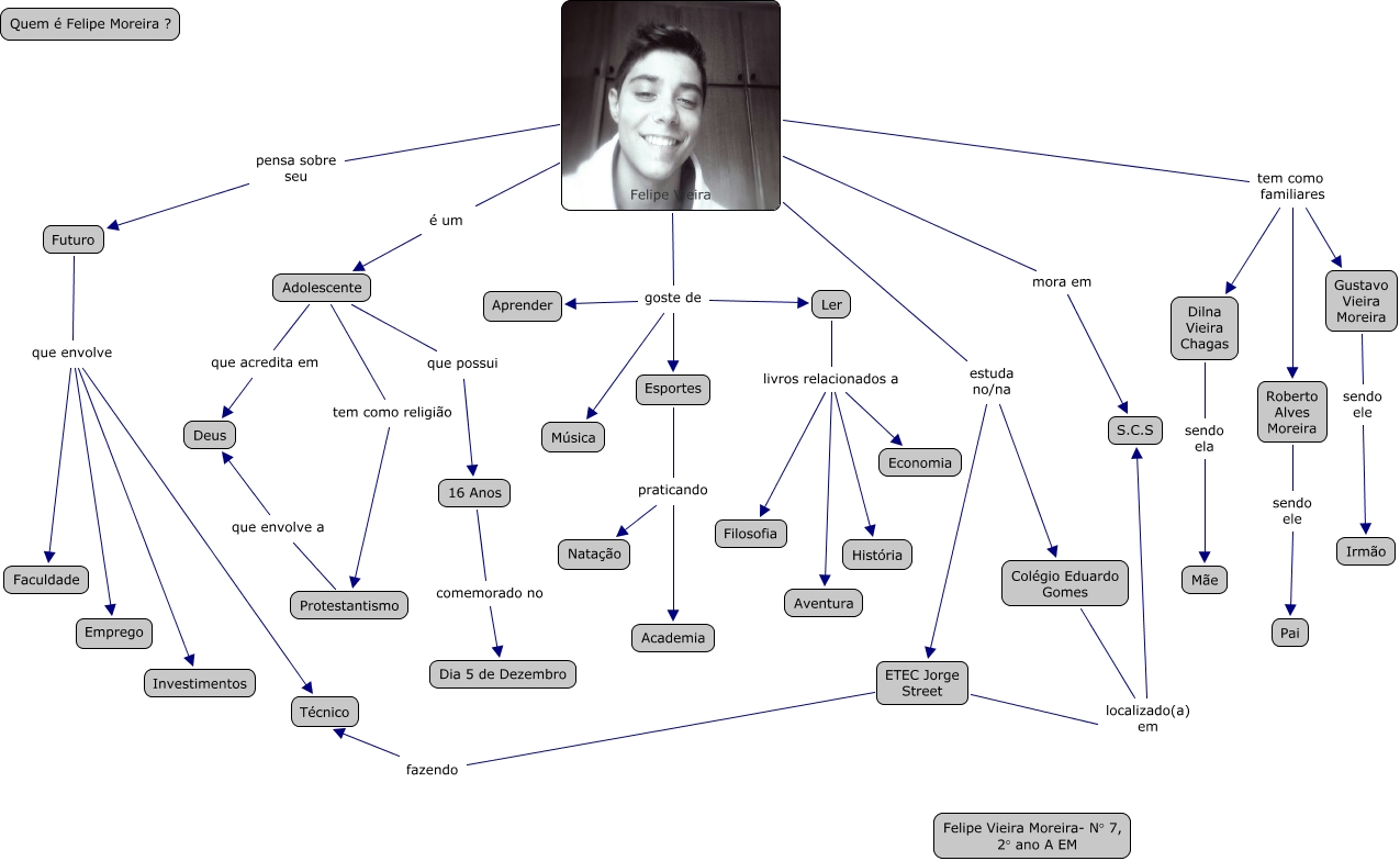 Esse mapa conceitual, produzido no IHMC CmapTools, tem a informação relacionada a: Felipe Vieira- N° 7, Felipe Vieira tem como familiares Dilna Vieira Chagas, Felipe Vieira tem como familiares Roberto Alves Moreira, Felipe Vieira estuda no/na ETEC Jorge Street, Ler livros relacionados a Filosofia, Futuro que envolve Técnico, Colégio Eduardo Gomes localizado(a) em S.C.S, Futuro que envolve Emprego, Roberto Alves Moreira sendo ele Pai, Adolescente tem como religião Protestantismo, Felipe Vieira goste de Música, Dilna Vieira Chagas sendo ela Mãe, Felipe Vieira estuda no/na Colégio Eduardo Gomes, Felipe Vieira tem como familiares Gustavo Vieira Moreira, Felipe Vieira goste de Aprender, Ler livros relacionados a História, 16 Anos comemorado no Dia 5 de Dezembro, Futuro que envolve Faculdade, Esportes praticando Natação, Gustavo Vieira Moreira sendo ele Irmão, Ler livros relacionados a Aventura