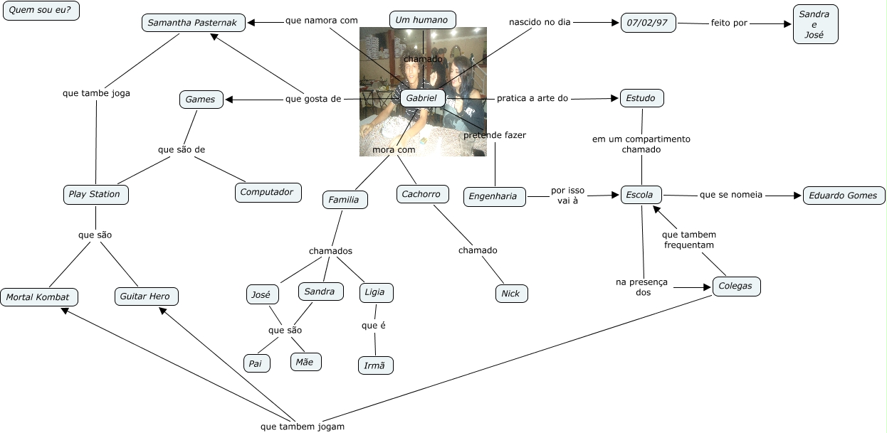 Esse mapa conceitual, produzido no IHMC CmapTools, tem a informação relacionada a: Trabalho quimica, Gabriel nascido no dia 07/02/97, Gabriel que namora com Samantha Pasternak, Samantha Pasternak que tambe joga Play Station, Ligia que é Irmã, Familia chamados Ligia, Familia chamados Sandra, José que são Pai, Cachorro chamado Nick, Colegas que tambem jogam Guitar Hero, Play Station que são Guitar Hero, Gabriel mora com Cachorro, 07/02/97 feito por Sandra e José, José que são Mãe, Escola que se nomeia Eduardo Gomes, Escola na presença dos Colegas, Games que são de Computador, Gabriel que gosta de Samantha Pasternak, Gabriel pratica a arte do Estudo, Colegas que tambem frequentam Escola, Sandra que são Pai