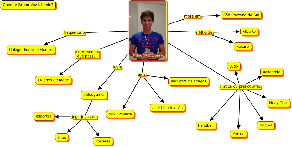 Esse mapa conceitual, produzido no IHMC CmapTools, tem a informação relacionada a: Bruno Vaz Libanio nº 3, Bruno Vaz Libanio frequenta o Colégio Eduardo Gomes, videogame joga jogos de tiros, Bruno Vaz Libanio pratica ou praticou/faz academia, videogame joga jogos de esportes, Bruno Vaz Libanio ama sair com os amigos, Bruno Vaz Libanio pratica ou praticou/faz Karate, Bruno Vaz Libanio ama ouvir musica, videogame joga jogos de corridas, Bruno Vaz Libanio pratica ou praticou/faz Muay Thai, Bruno Vaz Libanio pratica ou praticou/faz futebol, Bruno Vaz Libanio pratica ou praticou/faz handball, Bruno Vaz Libanio é filho de Alberto, Bruno Vaz Libanio mora em São Caetano do Sul, Bruno Vaz Libanio é filho de Rosana, Bruno Vaz Libanio é um menino que possui 16 anos de idade, Bruno Vaz Libanio joga videogame, Bruno Vaz Libanio pratica ou praticou/faz Judô, Bruno Vaz Libanio ama assistir televisão