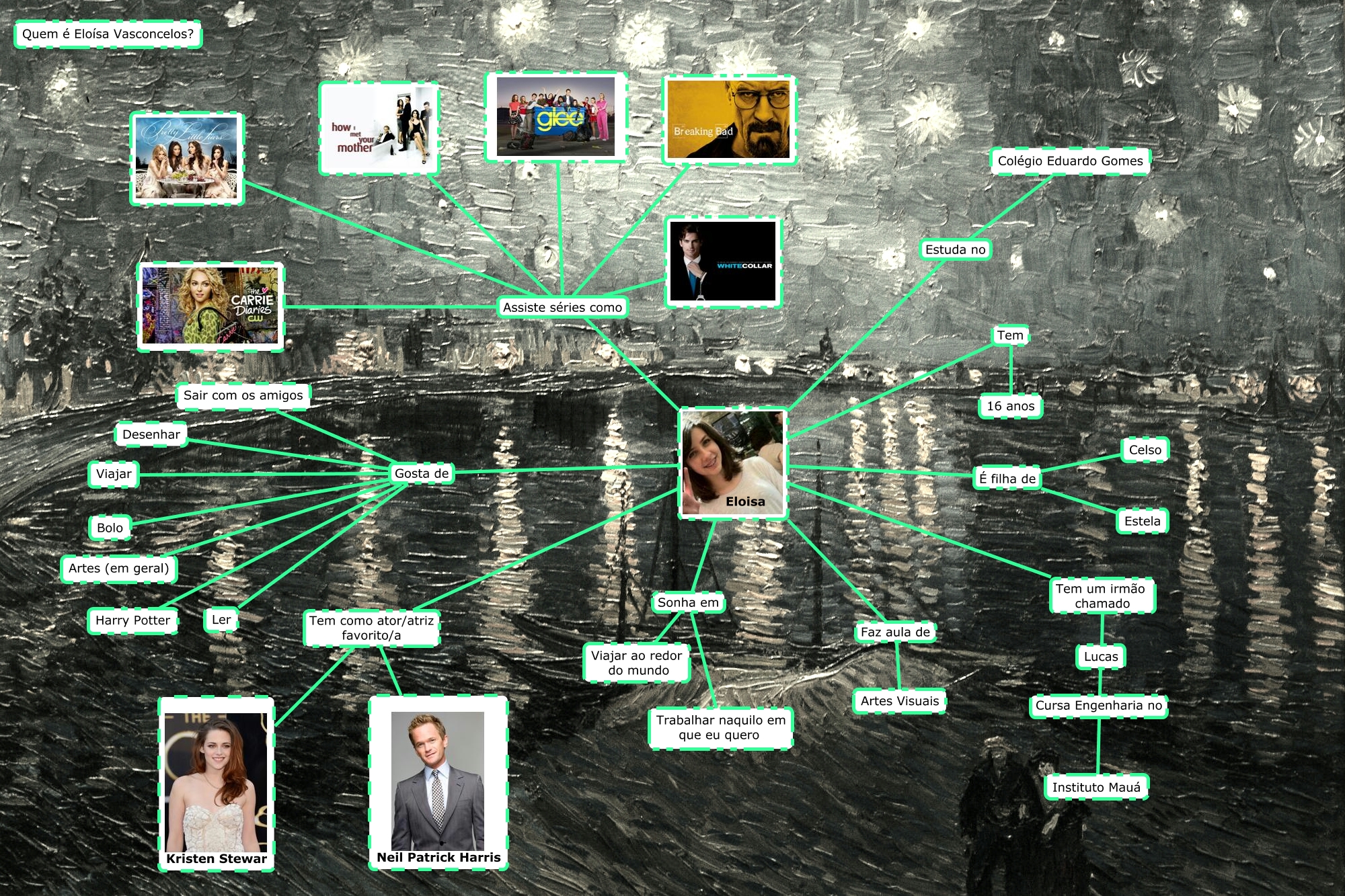 Esse mapa conceitual, produzido no IHMC CmapTools, tem a informação relacionada a: Quem é Eloisa Vasconcelos 2, Eloisa Assiste séries como, Eloisa Gosta de Ler, Eloisa Tem um irmão chamado Lucas, Eloisa Gosta de Viajar, Eloisa Gosta de Desenhar, Eloisa Assiste séries como, Eloisa Gosta de Harry Potter, Eloisa Tem como ator/atriz favorito/a Kristen Stewar, Eloisa É filha de Celso, Lucas Cursa Engenharia no Instituto Mauá, Eloisa É filha de Estela, Eloisa Sonha em Viajar ao redor do mundo, Eloisa Estuda no Colégio Eduardo Gomes, Eloisa Assiste séries como, Eloisa Gosta de Sair com os amigos, Eloisa Tem 16 anos, Eloisa Sonha em Trabalhar naquilo em que eu quero, Eloisa Gosta de Bolo, Eloisa Assiste séries como, Eloisa Faz aula de Artes Visuais