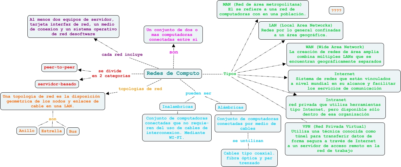 Este Cmap, tiene información relacionada con: Redes de Computo, Redes de Computo Tipos Intranet red privada que utiliza herramientas tipo Internet, pero disponible sólo dentro de esa organización, Alámbricas Conjunto de computadoras conectadas por medio de cables, Una topología de red es la disposición geométrica de los nodos y enlaces de cable en una LAN. son Bus, Conjunto de computadoras conectadas por medio de cables se untilizan Cables tipo coaxial. fibra óptica y par trenzado, Redes de Computo se divide en 2 categorias servidor-basado, Una topología de red es la disposición geométrica de los nodos y enlaces de cable en una LAN. son Estrella, Redes de Computo Tipos WAN (Wide Area Network) La creación de redes de área amplia combina múltiples LANs que se encuentran geográficamente separados, Una topología de red es la disposición geométrica de los nodos y enlaces de cable en una LAN. son Anillo, Redes de Computo se divide en 2 categorias peer-to-peer, Redes de Computo pueden ser Alámbricas, Inalambricas ???? Conjunto de computadoras conectadas que no requie- ren del uso de cables de interconexion. Mediante WI-FI., Redes de Computo topologías de red Una topología de red es la disposición geométrica de los nodos y enlaces de cable en una LAN., Redes de Computo Tipos LAN (Local Area Networks) Redes por lo general confinadas a un área geográfica., Redes de Computo Tipos VPN (Red Privada Virtual) Utiliza una técnica conocida como túnel para transferir datos de forma segura a través de Internet a un servidor de acceso remoto en la red de trabajo, Redes de Computo Tipos Internet Sistema de redes que están vinculados a nivel mundial en su alcance y facilitar los servicios de comunicación, Redes de Computo son Un conjunto de dos o mas computadoras conectadas entre sí, Redes de Computo cada red incluye Al menos dos equipos de servidor, tarjeta interfaz de red, un medio de conexion y un sistema operativo de red desoftware, Redes de Computo pueden ser Inalambricas, Redes de Computo Tipos MAN (Red de área metropolitana) El se refiere a una red de computadoras con en una población.