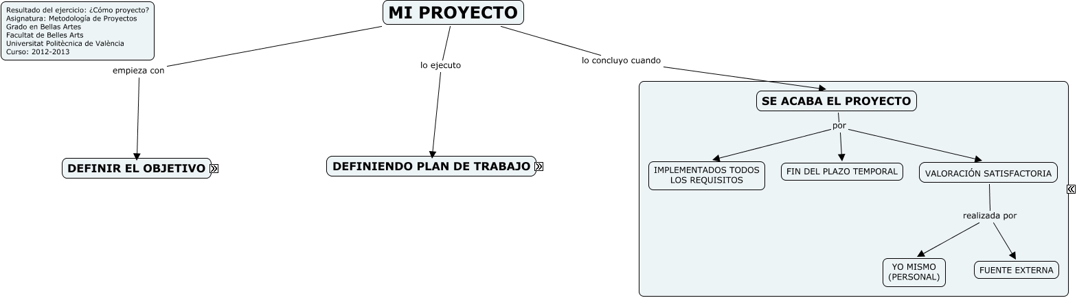 Este Cmap, tiene información relacionada con: Briones Sanjuan, Esteban, MI PROYECTO lo ejecuto DEFINIENDO PLAN DE TRABAJO, SUBPLAZO TEMPORAL CORTO para CREAR PARTE PARCIAL DE MI PROYECTO, BÚSQUEDA DE INFORMACIÓN DE APOYO realizando INVESTIGACIÓN DE ELEMENTOS DE INSPIRACIÓN (INFLUENCIAS), DEFINIR EL OBJETIVO mediante REFLEXIÓN PERSONAL, ESTABLECIANDO UN PLAZO TEMPORAL lo divido en N ITERACIONES, MI PROYECTO empieza con DEFINIR EL OBJETIVO, CUMPLE CON LOS REQUISITOS vuelvo a empezar con ITERACION i, SE ACABA EL PROYECTO por IMPLEMENTADOS TODOS LOS REQUISITOS, SE ACABA EL PROYECTO por VALORACIÓN SATISFACTORIA, REFLEXIÓN PERSONAL usando LISTADO DE REQUISITOS, MI PROYECTO lo concluyo cuando SE ACABA EL PROYECTO, LISTA PRIORIZADA DE CARACTERÍSTICAS lo divido en N ITERACIONES, SUBCONJUNTO DE CARACTERÍSTICAS para CREAR PARTE PARCIAL DE MI PROYECTO, VALORACIÓN SATISFACTORIA realizada por YO MISMO (PERSONAL), ITERACION i que contiene SUBPLAZO TEMPORAL CORTO, CREAR PARTE PARCIAL DE MI PROYECTO que evaluo si CUMPLE CON LOS REQUISITOS, ESTUDIO DE MERCADO seleccionando FUENTES DE INFORMACIÓN RELEVANTES, INVESTIGACIÓN DE ELEMENTOS DE INSPIRACIÓN (INFLUENCIAS) seleccionando FUENTES DE INFORMACIÓN RELEVANTES, FUENTES DE INFORMACIÓN RELEVANTES de las cuales EXTRAIGO LISTA DE CARACTERÍSTICAS DESEABLES, SE ACABA EL PROYECTO por FIN DEL PLAZO TEMPORAL
