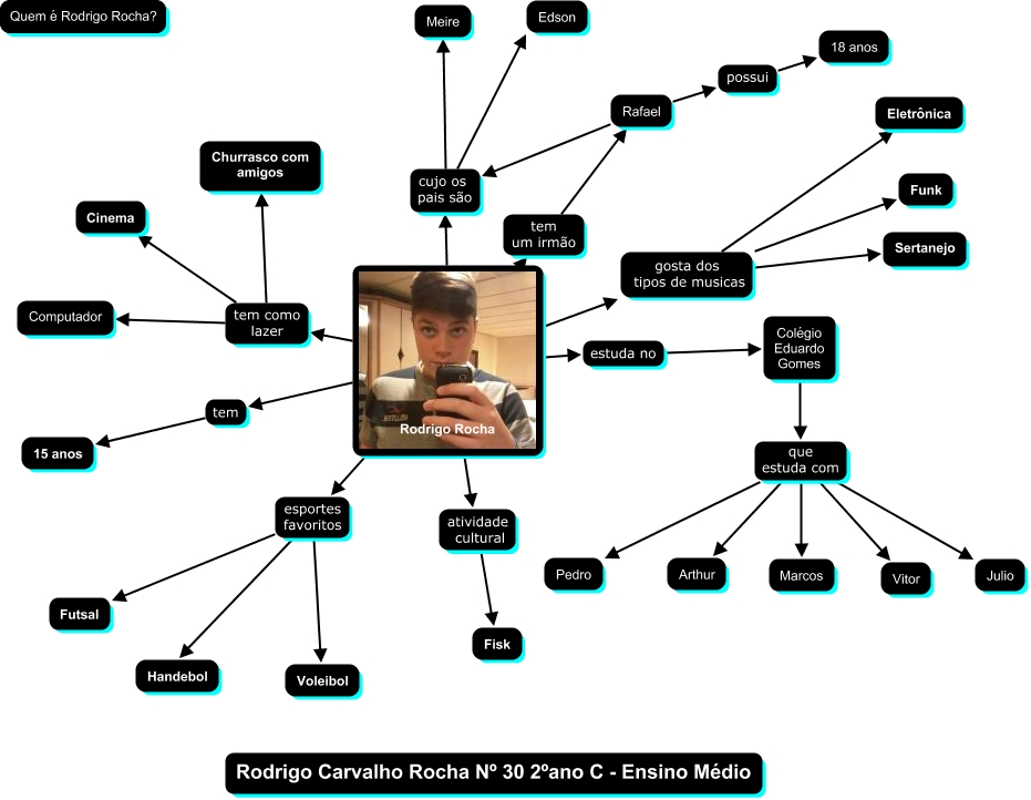 Esse mapa conceitual, produzido no IHMC CmapTools, tem a informação relacionada a: Rodrigo Rocha, Colégio Eduardo Gomes que estuda com Pedro, Rafael possui 18 anos, Rodrigo Rocha gosta dos tipos de musicas Eletrônica, Rodrigo Rocha tem um irmão Rafael, Rodrigo Rocha tem como lazer Churrasco com amigos, Rodrigo Rocha gosta dos tipos de musicas Sertanejo, Rafael cujo os pais são Edson, Rodrigo Rocha tem como lazer Computador, Rodrigo Rocha tem como lazer Cinema, Rodrigo Rocha atividade cultural Fisk, Rodrigo Rocha cujo os pais são Meire, Rafael cujo os pais são Meire, Rodrigo Rocha tem 15 anos, Rodrigo Rocha esportes favoritos Handebol, Colégio Eduardo Gomes que estuda com Arthur, Rodrigo Rocha esportes favoritos Futsal, Rodrigo Rocha estuda no Colégio Eduardo Gomes, Rodrigo Rocha gosta dos tipos de musicas Funk, Rodrigo Rocha esportes favoritos Voleibol, Colégio Eduardo Gomes que estuda com Marcos