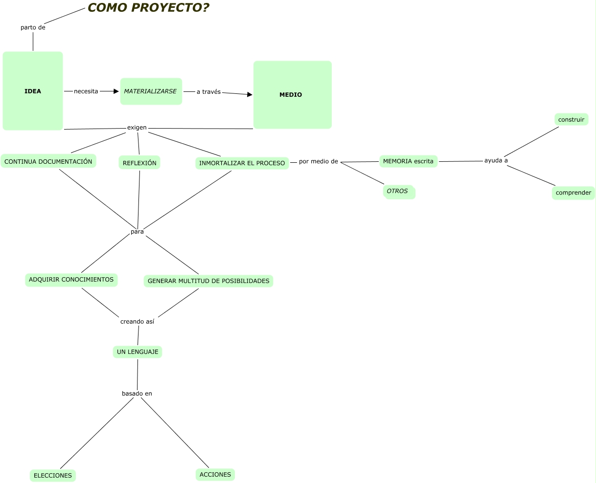 Este Cmap, tiene información relacionada con: COMO PROYECTO.ALMUDENA PEREZ, MEDIO exigen CONTINUA DOCUMENTACIÓN, CONTINUA DOCUMENTACIÓN para ADQUIRIR CONOCIMIENTOS, GENERAR MULTITUD DE POSIBILIDADES creando así UN LENGUAJE, ADQUIRIR CONOCIMIENTOS creando así UN LENGUAJE, UN LENGUAJE basado en ELECCIONES, IDEA exigen REFLEXIÓN, IDEA exigen CONTINUA DOCUMENTACIÓN, INMORTALIZAR EL PROCESO para GENERAR MULTITUD DE POSIBILIDADES, IDEA necesita MATERIALIZARSE, CONTINUA DOCUMENTACIÓN para GENERAR MULTITUD DE POSIBILIDADES, MEMORIA escrita ayuda a construir, MEMORIA escrita ayuda a comprender, IDEA exigen INMORTALIZAR EL PROCESO, INMORTALIZAR EL PROCESO por medio de MEMORIA escrita, MATERIALIZARSE a través MEDIO, MEDIO exigen INMORTALIZAR EL PROCESO, COMO PROYECTO? parto de IDEA, MEDIO exigen REFLEXIÓN, INMORTALIZAR EL PROCESO por medio de OTROS, UN LENGUAJE basado en ACCIONES