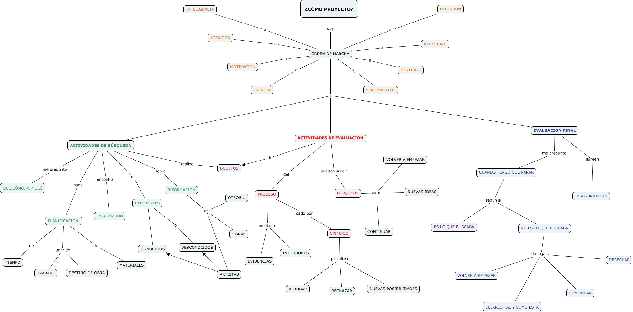 Este Cmap, tiene información relacionada con: CÓMO PROYECTO, LUCIA MOYA SÁEZ, PLANIFICACION lugar de TRABAJO, ORDEN DE MARCHA a INTUICION, ACTIVIDADES DE EVALUACION de BOCETOS, ARTISTAS ???? CONOCIDOS, NO ES LO QUE BUSCABA da lugar a CONTINUAR, ACTIVIDADES DE BÚSQUEDA realizo BOCETOS, ORDEN DE MARCHA a ENERGIA, BLOQUEOS para CONTINUAR, INFORMACION de OTROS..., NO ES LO QUE BUSCABA da lugar a DESECHAR, ORDEN DE MARCHA a SENTIDOS, NO ES LO QUE BUSCABA da lugar a VOLVER A EMPEZAR, ORDEN DE MARCHA a NECESIDAD, PLANIFICACION del TIEMPO, ACTIVIDADES DE BÚSQUEDA encontrar INSPIRACION, ORDEN DE MARCHA a SENTIMIENTOS, PLANIFICACION lugar de DESTINO DE OBRA, ACTIVIDADES DE EVALUACION pueden surgir BLOQUEOS, REFERENTES CONOCIDOS, ACTIVIDADES DE BÚSQUEDA me pregunto QUÉ,CÓMO,POR QUÉ