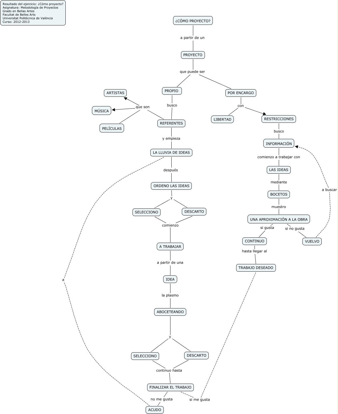 Este Cmap, tiene información relacionada con: cómo proyecto- Lorena Afonso de la Virgen, VUELVO a buscar INFORMACIÓN, ¿CÓMO PROYECTO? a partir de un PROYECTO, REFERENTES que son PELÍCULAS, RESTRICCIONES busco INFORMACIÓN, INFORMACIÓN comienzo a trabajar con LAS IDEAS, PROPIO busco REFERENTES, PROYECTO que puede ser POR ENCARGO, POR ENCARGO con LIBERTAD, REFERENTES que son MÚSICA, IDEA la plasmo ABOCETEANDO, FINALIZAR EL TRABAJO si me gusta TRABAJO DESEADO, A TRABAJAR a partir de una IDEA, SELECCIONO continuo hasta FINALIZAR EL TRABAJO, ORDENO LAS IDEAS y DESCARTO, LAS IDEAS mediante BOCETOS, BOCETOS muestro UNA APROXIMACIÓN A LA OBRA, ORDENO LAS IDEAS y SELECCIONO, A TRABAJAR comienzo SELECCIONO, ABOCETEANDO y DESCARTO, ABOCETEANDO y SELECCIONO