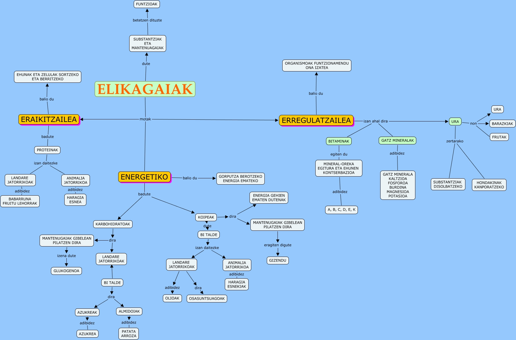 IHMC CmapTools-ekin sortu den kontzeptu-mapa honek honi buruzko informazioa du: TXANELA 4 ELIKAGAIAK, LANDARE JATORRIKOAK adibidez OLIOAK, ANIMALIA JATORRIKOA adibidez HARAGIA ESNEA, PROTEINAK izan daitezke LANDARE JATORRIKOAK, KOIPEAK dute BI TALDE, KARBOHIDRATOAK dira LANDARE JATORRIKOAK, KARBOHIDRATOAK dira MANTENUGAIAK GIBELEAN PILATZEN DIRA, ERAIKITZAILEA balio du EHUNAK ETA ZELULAK SORTZEKO ETA BERRITZEKO, BI TALDE ???? LANDARE JATORRIKOAK, GATZ MINERALAK adibidez GATZ MINERALA KALTZIOA FOSFOROA BURDINA MAGNESIOA POTASIOA, ENERGETIKO balio du GORPUTZA BEROTZEKO ENERGIA EMATEKO, BI TALDE izan daitezke ANIMALIA JATORRIKOA, URA non FRUTAK, ELIKAGAIAK motak ENERGETIKO, ELIKAGAIAK motak ERAIKITZAILEA, MINERAL-OREKA EGITURA ETA EHUNEN KONTSERBAZIOA adibidez A, B, C, D, E, K, LANDARE JATORRIKOAK dira OSASUNTSUAGOAK, ERREGULATZAILEA izan ahal dira BITAMINAK, ERREGULATZAILEA balio du ORGANISMOAK FUNTZIONAMENDU ONA IZATEA, ALMIDOIAK adibidez PATATA ARROZA, ENERGETIKO badute KARBOHIDRATOAK