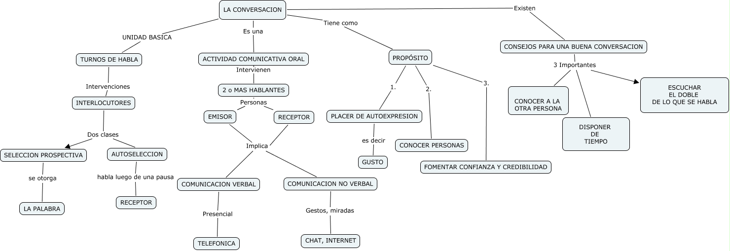 Este Cmap, tiene información relacionada con: LA CONVERSACION Y LA ESCUCHA ACTIVA, EMISOR Implica COMUNICACION NO VERBAL, LA CONVERSACION Existen CONSEJOS PARA UNA BUENA CONVERSACION, LA CONVERSACION Tiene como PROPÓSITO, SELECCION PROSPECTIVA se otorga LA PALABRA, RECEPTOR Implica COMUNICACION VERBAL, PROPÓSITO 2. CONOCER PERSONAS, CONSEJOS PARA UNA BUENA CONVERSACION 3 Importantes ESCUCHAR EL DOBLE DE LO QUE SE HABLA, CONSEJOS PARA UNA BUENA CONVERSACION 3 Importantes DISPONER DE TIEMPO, LA CONVERSACION Es una ACTIVIDAD COMUNICATIVA ORAL, PROPÓSITO 3. FOMENTAR CONFIANZA Y CREDIBILIDAD, COMUNICACION VERBAL Presencial TELEFONICA, CONSEJOS PARA UNA BUENA CONVERSACION 3 Importantes CONOCER A LA OTRA PERSONA, AUTOSELECCION habla luego de una pausa RECEPTOR, INTERLOCUTORES Dos clases AUTOSELECCION, PROPÓSITO 1. PLACER DE AUTOEXPRESION, PLACER DE AUTOEXPRESION es decir GUSTO, 2 o MAS HABLANTES Personas RECEPTOR, 2 o MAS HABLANTES Personas EMISOR, COMUNICACION NO VERBAL Gestos, miradas CHAT, INTERNET, ACTIVIDAD COMUNICATIVA ORAL Intervienen 2 o MAS HABLANTES