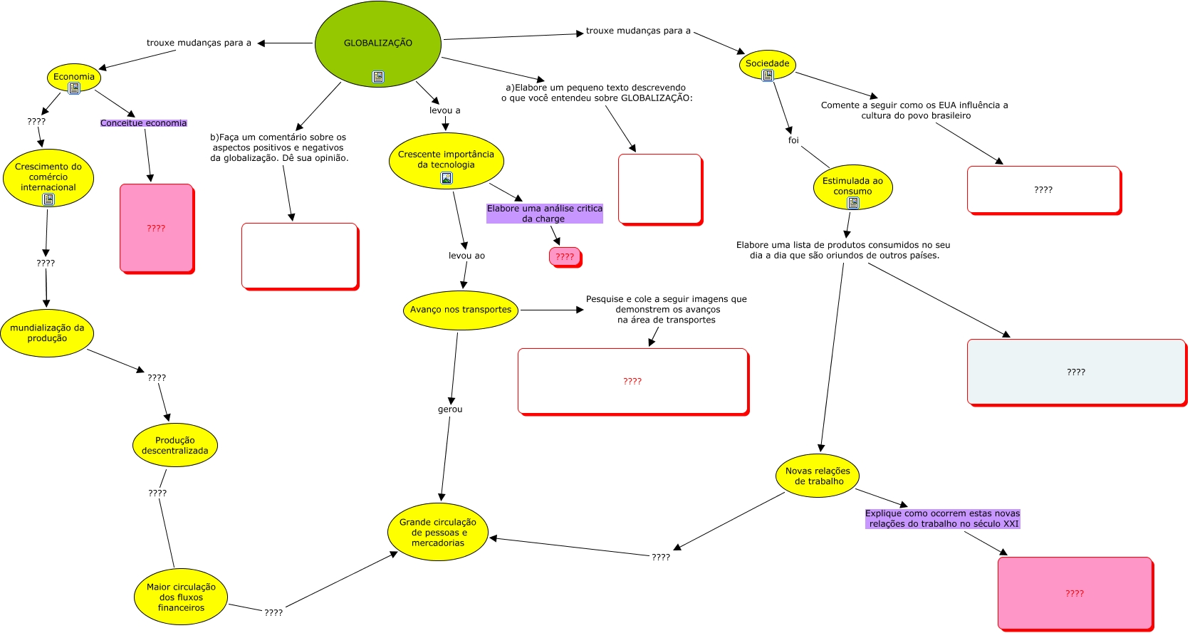 Esse mapa conceitual, produzido no IHMC CmapTools, tem a informação relacionada a: Globalização, Economia ???? Crescimento do comércio internacional, Sociedade foi Estimulada ao consumo, GLOBALIZAÇÃO a) Elabore um pequeno texto descrevendo o que você entendeu sobre GLOBALIZAÇÃO:, Estimulada ao consumo Elabore uma lista de produtos consumidos no seu dia a dia que são oriundos de outros países. ????, Economia Conceitue economia ????, Avanço nos transportes gerou Grande circulação de pessoas e mercadorias, Produção descentralizada ???? Maior circulação dos fluxos financeiros, Avanço nos transportes Pesquise e cole a seguir imagens que demonstrem os avanços na área de transportes ????, Crescente importância da tecnologia levou ao Avanço nos transportes, Maior circulação dos fluxos financeiros ???? Grande circulação de pessoas e mercadorias, GLOBALIZAÇÃO levou a Crescente importância da tecnologia, Novas relações de trabalho Explique como ocorrem estas novas relações do trabalho no século XXI ????, Sociedade Comente a seguir como os EUA influência a cultura do povo brasileiro ????, Crescimento do comércio internacional ???? mundialização da produção, GLOBALIZAÇÃO trouxe mudanças para a Sociedade, Novas relações de trabalho ???? Grande circulação de pessoas e mercadorias, GLOBALIZAÇÃO trouxe mudanças para a Economia, GLOBALIZAÇÃO b) Faça um comentário sobre os aspectos positivos e negativos da globalização. Dê sua opinião., mundialização da produção ???? Produção descentralizada, Crescente importância da tecnologia Elabore uma análise critica da charge ????