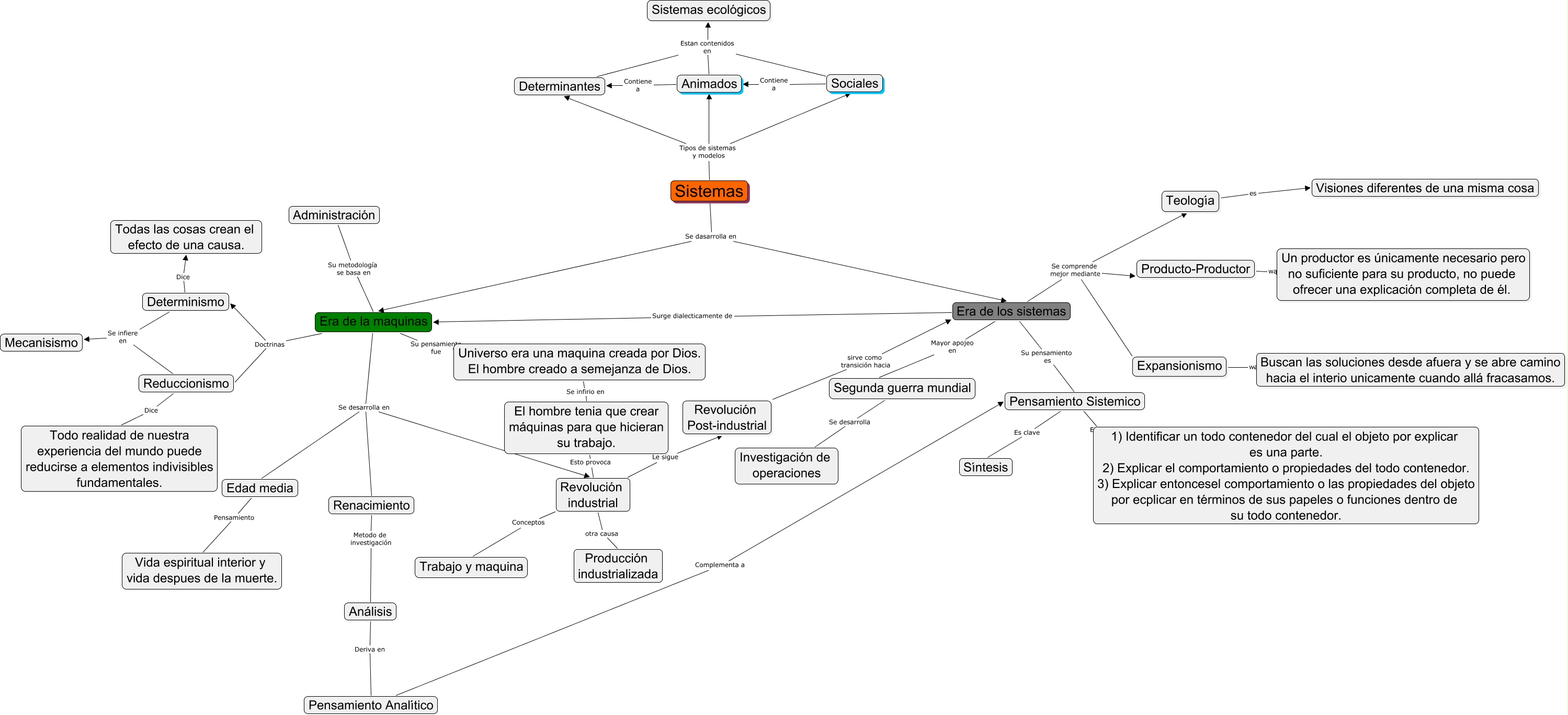 Este Cmap, tiene información relacionada con: Mapa de resumen, Revolución industrial Le sigue Revolución Post-industrial, El hombre tenia que crear máquinas para que hicieran su trabajo. Esto provoca Revolución industrial, Sistemas Se dasarrolla en Era de los sistemas, Era de la maquinas Doctrinas Reduccionismo, Animados Contiene a Determinantes, Pensamiento Sistemico Etapas 1) Identificar un todo contenedor del cual el objeto por explicar es una parte. 2) Explicar el comportamiento o propiedades del todo contenedor. 3) Explicar entoncesel comportamiento o las propiedades del objeto por ecplicar en términos de sus papeles o funciones dentro de su todo contenedor., Teología es Visiones diferentes de una misma cosa, Era de los sistemas Su pensamiento es Pensamiento Sistemico, Era de la maquinas Se desarrolla en Renacimiento, Determinismo Dice Todas las cosas crean el efecto de una causa., Edad media Pensamiento Vida espiritual interior y vida despues de la muerte., Era de los sistemas Mayor apojeo en Segunda guerra mundial, Pensamiento Sistemico Es clave Síntesis, Era de los sistemas Surge dialecticamente de Era de la maquinas, Animados Estan contenidos en Sistemas ecológicos, Sociales Estan contenidos en Sistemas ecológicos, Sistemas Se dasarrolla en Era de la maquinas, Segunda guerra mundial Se desarrolla Investigación de operaciones, Reduccionismo Dice Todo realidad de nuestra experiencia del mundo puede reducirse a elementos indivisibles fundamentales., Administración Su metodología se basa en Era de la maquinas