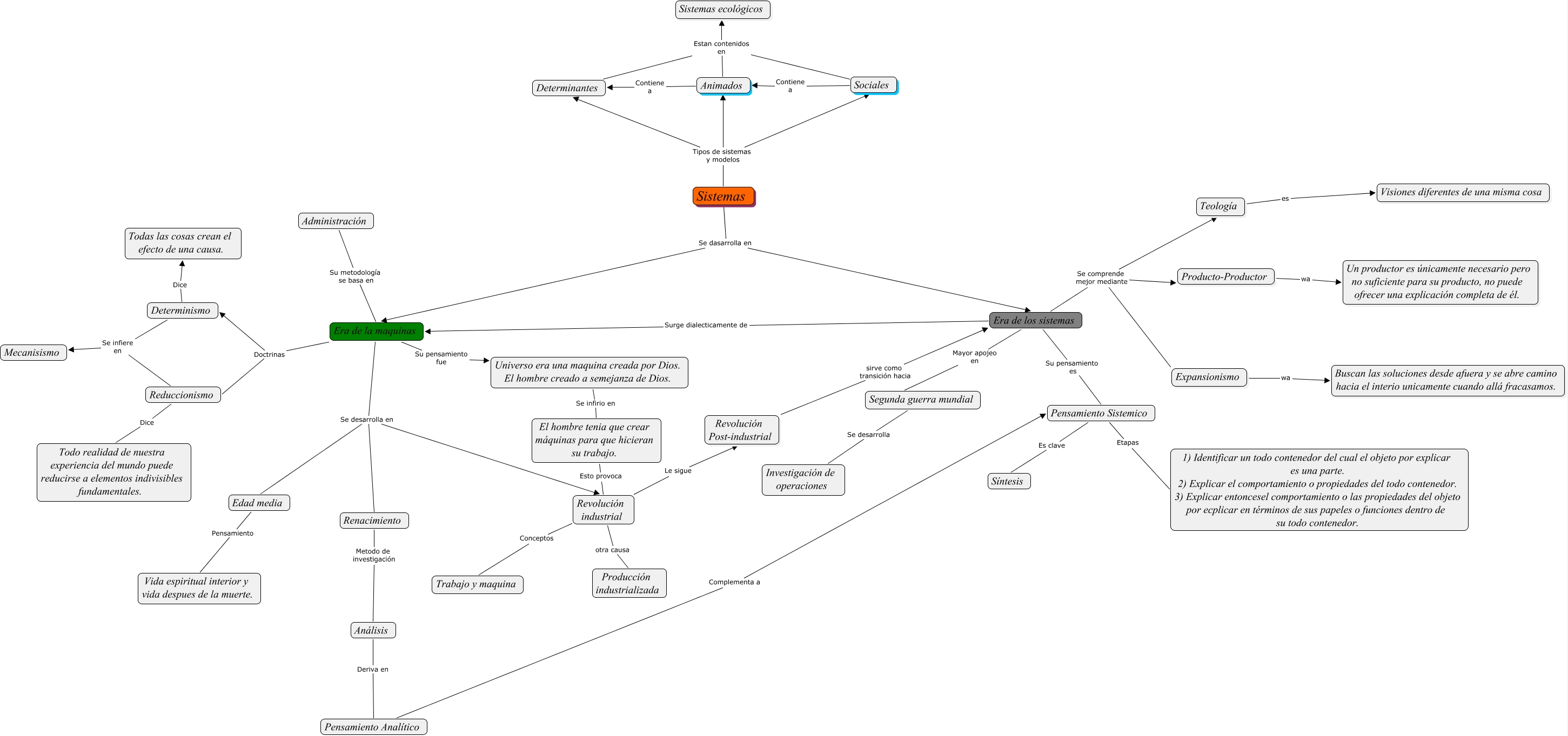 Este Cmap, tiene información relacionada con: Mapa de resumen, Revolución industrial Le sigue Revolución Post-industrial, Sistemas Se dasarrolla en Era de los sistemas, El hombre tenia que crear máquinas para que hicieran su trabajo. Esto provoca Revolución industrial, Era de la maquinas Doctrinas Reduccionismo, Pensamiento Sistemico Etapas 1) Identificar un todo contenedor del cual el objeto por explicar es una parte. 2) Explicar el comportamiento o propiedades del todo contenedor. 3) Explicar entoncesel comportamiento o las propiedades del objeto por ecplicar en términos de sus papeles o funciones dentro de su todo contenedor., Animados Contiene a Determinantes, Era de los sistemas Su pensamiento es Pensamiento Sistemico, Teología es Visiones diferentes de una misma cosa, Era de la maquinas Se desarrolla en Renacimiento, Era de los sistemas Mayor apojeo en Segunda guerra mundial, Edad media Pensamiento Vida espiritual interior y vida despues de la muerte., Determinismo Dice Todas las cosas crean el efecto de una causa., Sistemas Se dasarrolla en Era de la maquinas, Sociales Estan contenidos en Sistemas ecológicos, Animados Estan contenidos en Sistemas ecológicos, Era de los sistemas Surge dialecticamente de Era de la maquinas, Pensamiento Sistemico Es clave Síntesis, Reduccionismo Dice Todo realidad de nuestra experiencia del mundo puede reducirse a elementos indivisibles fundamentales., Segunda guerra mundial Se desarrolla Investigación de operaciones, Determinismo Se infiere en Mecanisismo