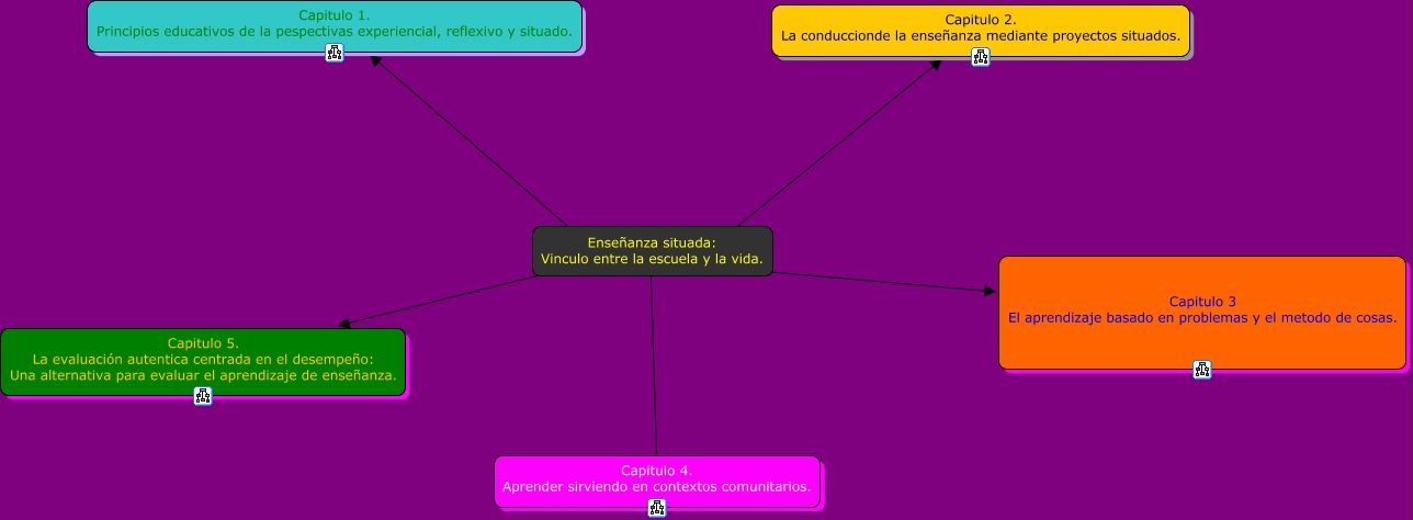 Este Cmap, tiene información relacionada con: Enseñanza situada, Enseñanza situada: Vinculo entre la escuela y la vida. ???? Capitulo 2. La conduccionde la enseñanza mediante proyectos situados., Enseñanza situada: Vinculo entre la escuela y la vida. ???? Capitulo 5. La evaluación autentica centrada en el desempeño: Una alternativa para evaluar el aprendizaje de enseñanza., Enseñanza situada: Vinculo entre la escuela y la vida. ???? Capitulo 4. Aprender sirviendo en contextos comunitarios., Enseñanza situada: Vinculo entre la escuela y la vida. ???? Capitulo 1. Principios educativos de la pespectivas experiencial, reflexivo y situado., Enseñanza situada: Vinculo entre la escuela y la vida. ???? Capitulo 3 El aprendizaje basado en problemas y el metodo de cosas.