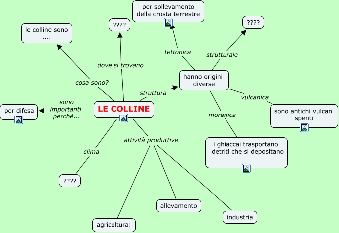 Questa Cmap, creata con IHMC CmapTools, contiene informazioni relative a: le colline, LE COLLINE attività produttive industria, LE COLLINE struttura hanno origini diverse, LE COLLINE clima ????, LE COLLINE cosa sono? le colline sono ...., LE COLLINE attività produttive agricoltura:, LE COLLINE dove si trovano ????, hanno origini diverse strutturale ????, LE COLLINE sono importanti perchè... per difesa, LE COLLINE attività produttive allevamento, hanno origini diverse morenica i ghiaccai trasportano detriti che si depositano, hanno origini diverse tettonica per sollevamento della crosta terrestre, hanno origini diverse vulcanica sono antichi vulcani spenti