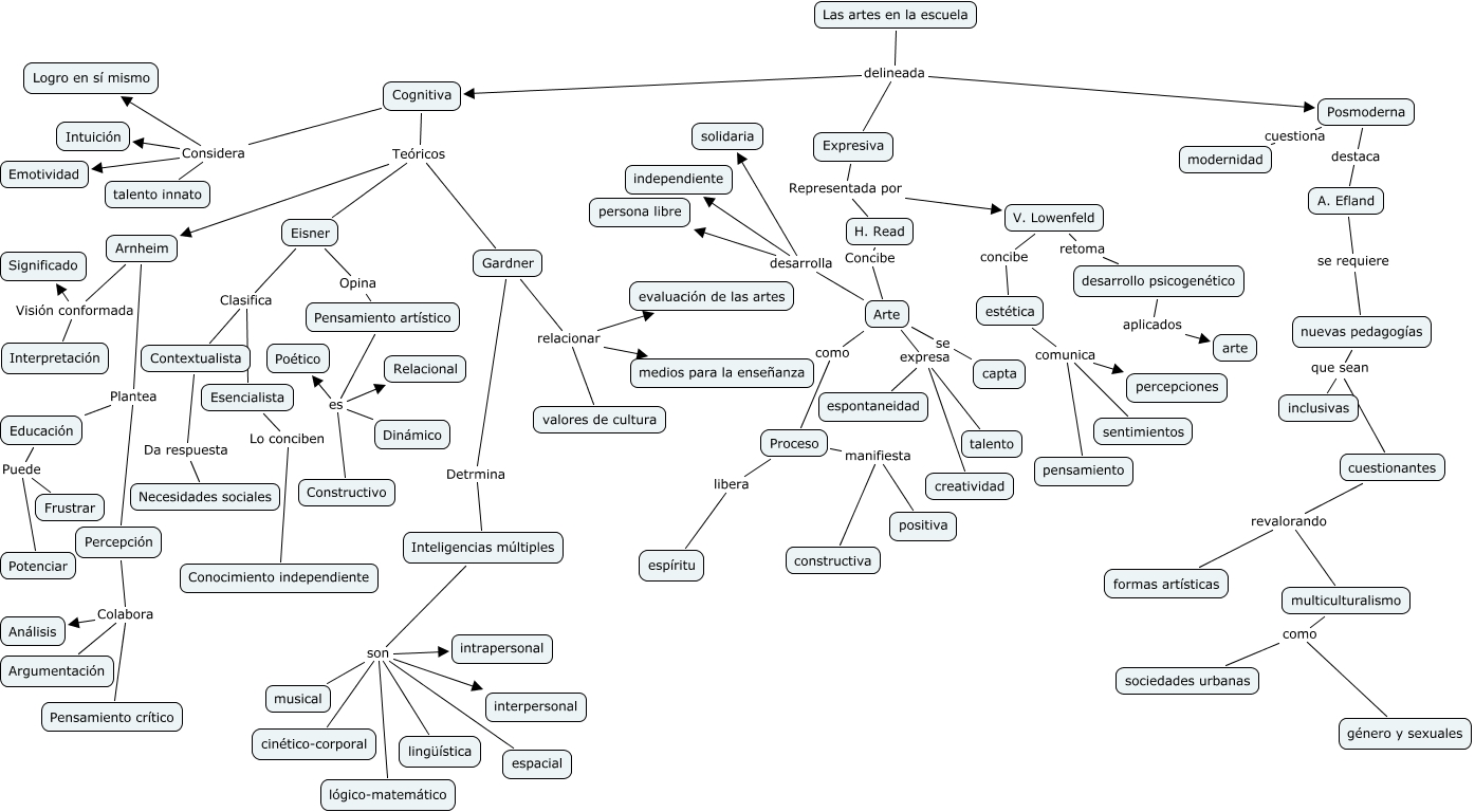 Este Cmap, tiene información relacionada con: Enseñanza de las artes, Arte expresa talento, Contextualista Da respuesta Necesidades sociales, H. Read Concibe Arte, Proceso manifiesta constructiva, Pensamiento artístico es Dinámico, Arnheim Visión conformada Interpretación, Las artes en la escuela delineada Expresiva, Arte se capta, nuevas pedagogías que sean inclusivas, multiculturalismo como género y sexuales, Arte desarrolla solidaria, Inteligencias múltiples son interpersonal, Posmoderna destaca A. Efland, Educación Puede Potenciar, A. Efland se requiere nuevas pedagogías, Inteligencias múltiples son cinético-corporal, Gardner relacionar medios para la enseñanza, estética comunica sentimientos, Inteligencias múltiples son musical, Arnheim Plantea Percepción