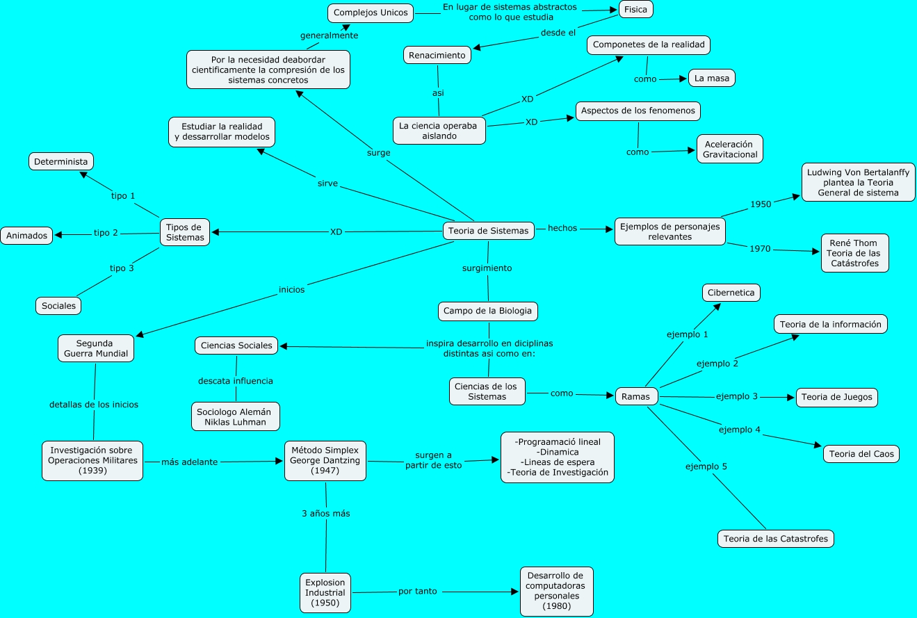 Este Cmap, tiene información relacionada con: i.o, Segunda Guerra Mundial detallas de los inicios Investigación sobre Operaciones Militares (1939), La ciencia operaba aislando XD Componetes de la realidad, Ejemplos de personajes relevantes 1970 René Thom Teoria de las Catástrofes, Tipos de Sistemas tipo 3 Sociales, Renacimiento asi La ciencia operaba aislando, Aspectos de los fenomenos como Aceleración Gravitacional, Ciencias Sociales descata influencia Sociologo Alemán Niklas Luhman, Explosion Industrial (1950) por tanto Desarrollo de computadoras personales (1980), Ramas ejemplo 3 Teoria de Juegos, Teoria de Sistemas inicios Segunda Guerra Mundial, Campo de la Biologia inspira desarrollo en diciplinas distintas asi como en: Ciencias de los Sistemas, Ciencias de los Sistemas como Ramas, Componetes de la realidad como La masa, La ciencia operaba aislando XD Aspectos de los fenomenos, Teoria de Sistemas surge Por la necesidad deabordar cientificamente la compresión de los sistemas concretos, Ramas ejemplo 4 Teoria del Caos, Teoria de Sistemas sirve Estudiar la realidad y dessarrollar modelos, Teoria de Sistemas hechos Ejemplos de personajes relevantes, Teoria de Sistemas XD Tipos de Sistemas, Ejemplos de personajes relevantes 1950 Ludwing Von Bertalanffy plantea la Teoria General de sistema
