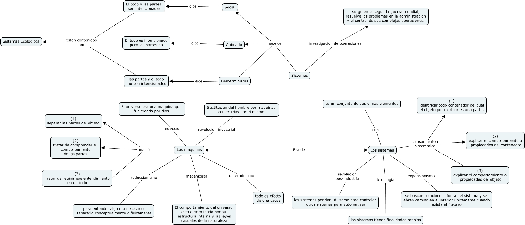 Este Cmap, tiene información relacionada con: sistemas, Las maquinas analisis (2) tratar de comprender el comportamiento de las partes, El universo era una maquina que fue creada por dios. se creia Las maquinas, Los sistemas revolucion pos-industrial los sistemas podrian utilizarse para controlar otros sistemas para automatizar, Sistemas modelos Animado, Las maquinas analisis (1) separar las partes del objeto, Sistemas Era de Los sistemas, El todo es intencionado pero las partes no estan contenidos en Sistemas Ecologicos, Las maquinas determinismo todo es efecto de una causa, Social dice El todo y las partes son intencionadas, Sistemas modelos Social, las partes y el todo no son intencionados estan contenidos en Sistemas Ecologicos, Los sistemas pensamienton sistematico (1) identificar todo contenedor del cual el objeto por explicar es una parte., Sustitucion del hombre por maquinas construidas por el mismo. revolucion industrial Las maquinas, Sistemas investigacion de operaciones surge en la segunda guerra mundial, resuelve los problemas en la administracion y el control de sus complejas operaciones., Los sistemas teleologia los sistemas tienen finalidades propias, Las maquinas reduccionismo para entender algo era necesario separarlo conceptualmente o fisicamente, Desterministas dice las partes y el todo no son intencionados, Los sistemas pensamienton sistematico (3) explicar el comportamiento o propiedades del objeto, Los sistemas pensamienton sistematico (2) explicar el comportamiento o propiedades del contenedor, Las maquinas analisis (3) Tratar de reuinir ese entendimiento en un todo