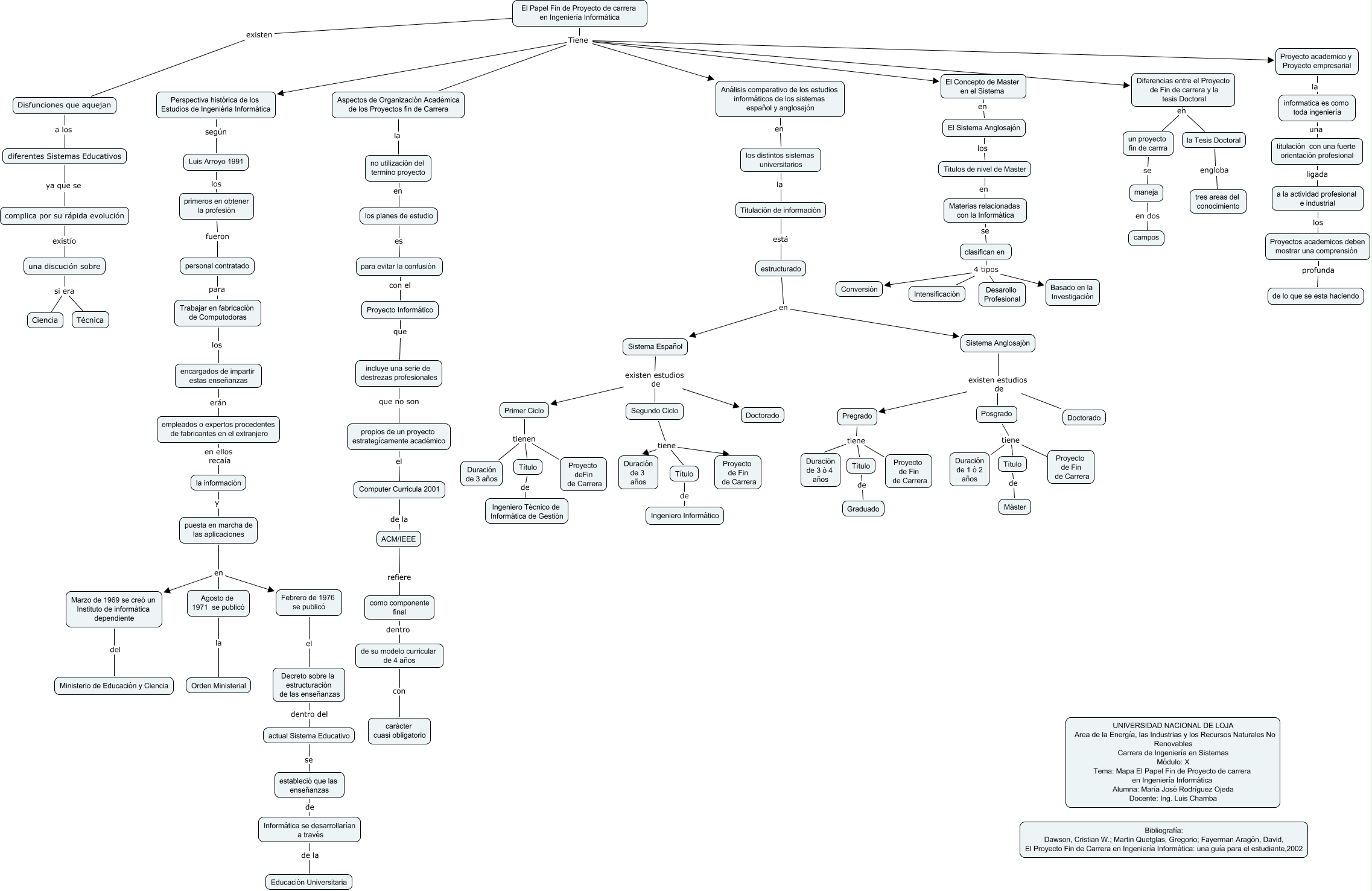 Este Cmap, tiene información relacionada con: PapelFinPFCIngInformatica, Pregrado tiene Proyecto de Fin de Carrera, clasifican en 4 tipos Basado en la Investigación, Proyecto academico y Proyecto empresarial la informatica es como toda ingeniería, titulación con una fuerte orientación profesional ligada a la actividad profesional e industrial, Marzo de 1969 se creó un Instituto de informática dependiente del Ministerio de Educación y Ciencia, Computer Curricula 2001 de la ACM/IEEE, Titulación de información está estructurado, Posgrado tiene Duración de 1 ó 2 años, Sistema Español existen estudios de Primer Ciclo, Sistema Anglosajón existen estudios de Posgrado, una discución sobre si era Ciencia, El Papel Fin de Proyecto de carrera en Ingeniería Informática Tiene Perspectiva histórica de los Estudios de Ingeniéria Informática, propios de un proyecto estrategícamente académico el Computer Curricula 2001, diferentes Sistemas Educativos ya que se complica por su rápida evolución, El Concepto de Master en el Sistema en El Sistema Anglosajón, Decreto sobre la estructuración de las enseñanzas dentro del actual Sistema Educativo, los distintos sistemas universitarios la Titulación de información, El Sistema Anglosajón los Titulos de nivel de Master, no utilización del termino proyecto en los planes de estudio, personal contratado para Trabajar en fabricación de Computodoras