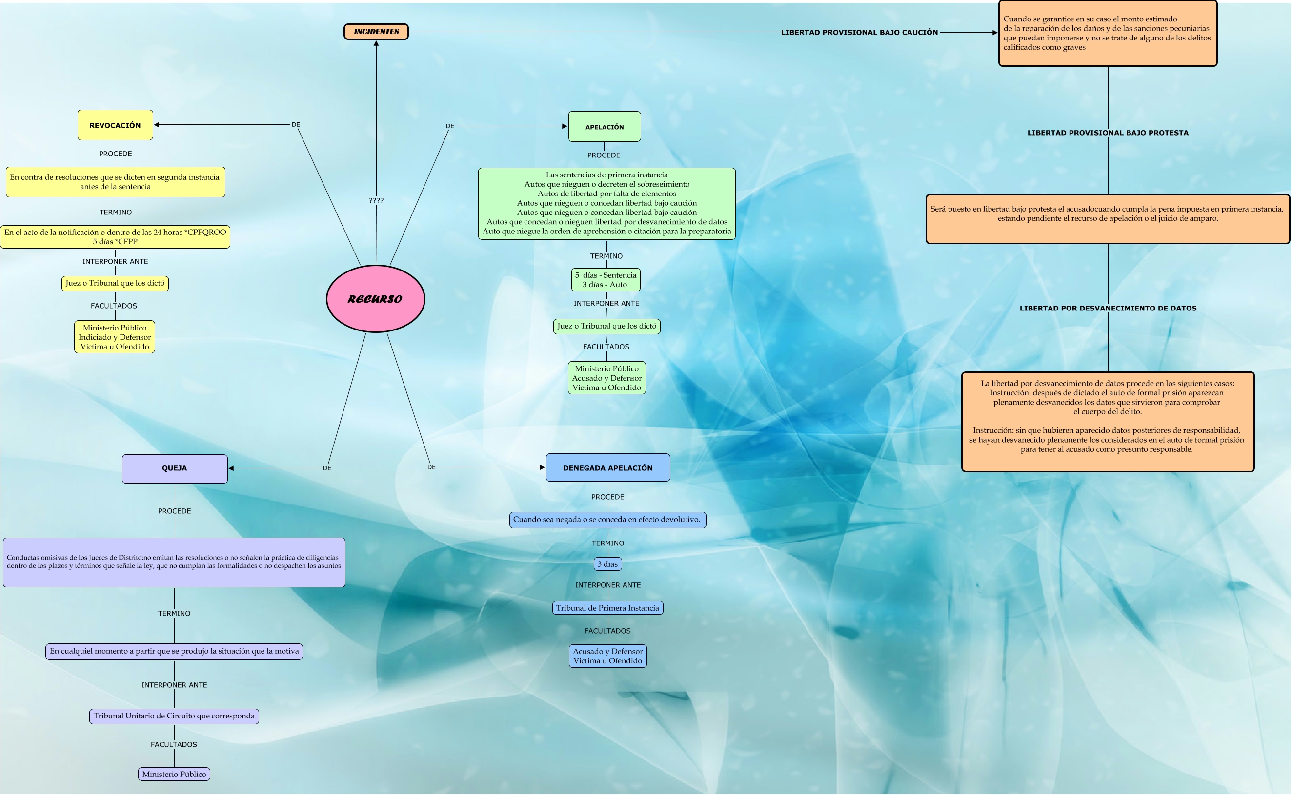 Este Cmap, tiene información relacionada con: INCIDENTES-RECURSOS, Conductas omisivas de los Jueces de Distrito:no emitan las resoluciones o no señalen la práctica de diligencias dentro de los plazos y términos que señale la ley, que no cumplan las formalidades o no despachen los asuntos TERMINO En cualquiel momento a partir que se produjo la situación que la motiva, Juez o Tribunal que los dictó FACULTADOS Ministerio Público Indiciado y Defensor Victima u Ofendido, RECURSO ???? INCIDENTES, Será puesto en libertad bajo protesta el acusadocuando cumpla la pena impuesta en primera instancia, estando pendiente el recurso de apelación o el juicio de amparo. LIBERTAD POR DESVANECIMIENTO DE DATOS La libertad por desvanecimiento de datos procede en los siguientes casos: Instrucción: después de dictado el auto de formal prisión aparezcan plenamente desvanecidos los datos que sirvieron para comprobar el cuerpo del delito. Instrucción: sin que hubieren aparecido datos posteriores de responsabilidad, se hayan desvanecido plenamente los considerados en el auto de formal prisión para tener al acusado como presunto responsable., RECURSO DE REVOCACIÓN, RECURSO DE DENEGADA APELACIÓN, Juez o Tribunal que los dictó FACULTADOS Ministerio Público Acusado y Defensor Victima u Ofendido, Tribunal de Primera Instancia FACULTADOS Acusado y Defensor Victima u Ofendido, 3 días INTERPONER ANTE Tribunal de Primera Instancia, QUEJA PROCEDE Conductas omisivas de los Jueces de Distrito:no emitan las resoluciones o no señalen la práctica de diligencias dentro de los plazos y términos que señale la ley, que no cumplan las formalidades o no despachen los asuntos, 5 días - Sentencia 3 días - Auto INTERPONER ANTE Juez o Tribunal que los dictó, En el acto de la notificación o dentro de las 24 horas *CPPQROO 5 días *CFPP INTERPONER ANTE Juez o Tribunal que los dictó, En contra de resoluciones que se dicten en segunda instancia antes de la sentencia TERMINO En el acto de la notificación o dentro de las 24 horas *CPPQROO 5 días *CFPP, INCIDENTES LIBERTAD PROVISIONAL BAJO CAUCIÓN Cuando se garantice en su caso el monto estimado de la reparación de los daños y de las sanciones pecuniarias que puedan imponerse y no se trate de alguno de los delitos calificados como graves, DENEGADA APELACIÓN PROCEDE Cuando sea negada o se conceda en efecto devolutivo., RECURSO DE APELACIÓN, RECURSO DE QUEJA, Tribunal Unitario de Circuito que corresponda FACULTADOS Ministerio Público, Cuando se garantice en su caso el monto estimado de la reparación de los daños y de las sanciones pecuniarias que puedan imponerse y no se trate de alguno de los delitos calificados como graves LIBERTAD PROVISIONAL BAJO PROTESTA Será puesto en libertad bajo protesta el acusadocuando cumpla la pena impuesta en primera instancia, estando pendiente el recurso de apelación o el juicio de amparo., En cualquiel momento a partir que se produjo la situación que la motiva INTERPONER ANTE Tribunal Unitario de Circuito que corresponda