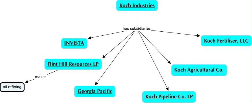 This Concept Map, created with IHMC CmapTools, has information related to: Koch subsidiaries, Koch Industries has subsidiaries Koch Agricultural Co., Koch Industries has subsidiaries Georgia Pacific, Flint Hill Resources LP makes oil refining, Koch Industries has subsidiaries Koch Pipeline Co. LP, Koch Industries has subsidiaries INVISTA, Koch Industries has subsidiaries Flint Hill Resources LP, Koch Industries has subsidiaries Koch Fertiliser, LLC