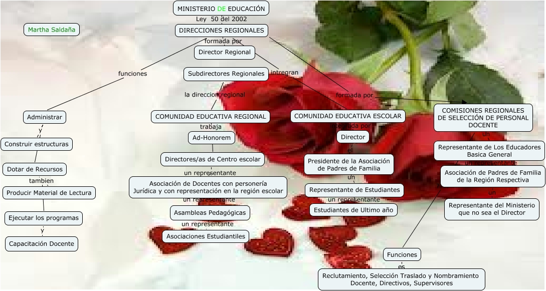 Este Cmap, tiene información relacionada con: Ley 50, Representante de Los Educadores Basica General un representante Asociación de Padres de Familia de la Región Respectiva, Administrar y Construir estructuras, Presidente de la Asociación de Padres de Familia un Representante de Estudiantes, Directores/as de Centro escolar un representante Asociación de Docentes con personería Jurídica y con representación en la región escolar, COMISIONES REGIONALES DE SELECCIÓN DE PERSONAL DOCENTE ???? Funciones, DIRECCIONES REGIONALES funciones Administrar, Subdirectores Regionales la direccion regional COMUNIDAD EDUCATIVA REGIONAL, DIRECCIONES REGIONALES formada por COMISIONES REGIONALES DE SELECCIÓN DE PERSONAL DOCENTE, COMUNIDAD EDUCATIVA ESCOLAR integrada por Director, Funciones es Reclutamiento, Selección Traslado y Nombramiento Docente, Directivos, Supervisores, Representante de Estudiantes un representante Estudiantes de Ultimo año, COMISIONES REGIONALES DE SELECCIÓN DE PERSONAL DOCENTE un Representante de Los Educadores Basica General, Dotar de Recursos tambien Ejecutar los programas, Ejecutar los programas y Capacitación Docente, Asociación de Padres de Familia de la Región Respectiva un Representante del Ministerio que no sea el Director, Asociación de Docentes con personería Jurídica y con representación en la región escolar un representante Asambleas Pedagógicas, MINISTERIO DE EDUCACIÓN Ley 50 del 2002 DIRECCIONES REGIONALES, DIRECCIONES REGIONALES formada por Director Regional, Administrar y Dotar de Recursos, Asambleas Pedagógicas un representante Asociaciones Estudiantiles