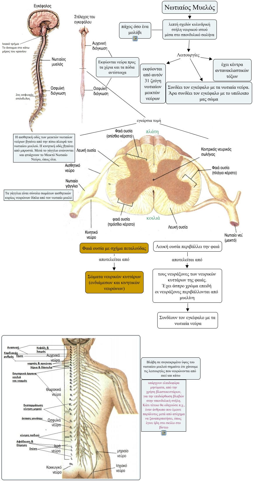 This Concept Map, created with IHMC CmapTools, has information related to: 5. Spinal cord, ___ εγκάρσια τομή, Φαιά ουσία με σχήμα πεταλούδας αποτελείται από Σώματα νευρικών κυττάρων (ενδιάμεσων και κινητικών νευρώνων), ___ εγκάρσια τομή, λεπτή σχεδόν κυλινδρική στήλη νευρικού ιστού μέσα στο σπονδυλικό σωλήνα Λειτουργίες έχει κέντρα αντανακλαστικών τόξων, Λευκή ουσία περιβάλλει την φαιά αποτελείται από τους νευράξονες των νευρικών κυττάρων της φαιάς. Έχει άσπρο χρώμα επειδή οι νευράξονες περιβάλλονται από μυελίνη, Εκφύονται νεύρα προς τα χέρια και τα πόδια αντίστοιχα, λεπτή σχεδόν κυλινδρική στήλη νευρικού ιστού μέσα στο σπονδυλικό σωλήνα Λειτουργίες εκφύονται από αυτόν 31 ζεύγη νωτιαίων μεικτών νεύρων, λεπτή σχεδόν κυλινδρική στήλη νευρικού ιστού μέσα στο σπονδυλικό σωλήνα πάχος όσο ένα μολύβι, τους νευράξονες των νευρικών κυττάρων της φαιάς. Έχει άσπρο χρώμα επειδή οι νευράξονες περιβάλλονται από μυελίνη Συνδέουν τον εγκέφαλο με τα νωτιαία νεύρα, Νωτιαίος Μυελός λεπτή σχεδόν κυλινδρική στήλη νευρικού ιστού μέσα στο σπονδυλικό σωλήνα, Εκφύονται νεύρα προς τα χέρια και τα πόδια αντίστοιχα, λεπτή σχεδόν κυλινδρική στήλη νευρικού ιστού μέσα στο σπονδυλικό σωλήνα Λειτουργίες Συνδέει τον εγκέφαλο με τα νωτιαία νεύρα. Άρα συνδέει τον εγκέφαλο με το υπόλοιπο μας σώμα