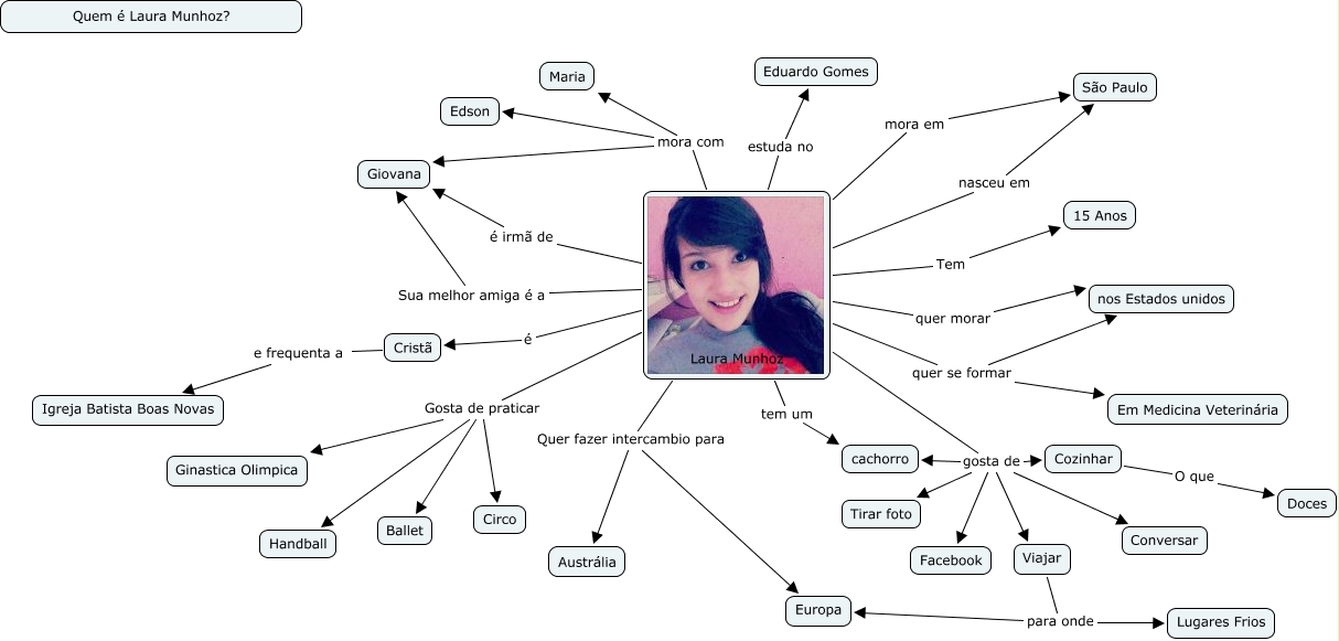 Esse mapa conceitual, produzido no IHMC CmapTools, tem a informação relacionada a: Laura Munhoz n°21, Laura Munhoz Quer fazer intercambio para Europa, Laura Munhoz quer se formar nos Estados unidos, Cozinhar O que Doces, Laura Munhoz nasceu em São Paulo, Laura Munhoz Sua melhor amiga é a Giovana, Laura Munhoz é Cristã, Laura Munhoz mora com Maria, Viajar para onde Lugares Frios, Laura Munhoz é irmã de Giovana, Laura Munhoz quer se formar Em Medicina Veterinária, Laura Munhoz gosta de Conversar, Laura Munhoz gosta de Facebook, Laura Munhoz mora em São Paulo, Laura Munhoz Tem 15 Anos, Viajar para onde Europa, Laura Munhoz gosta de Viajar, Laura Munhoz Gosta de praticar Circo, Laura Munhoz mora com Giovana, Cristã e frequenta a Igreja Batista Boas Novas, Laura Munhoz tem um cachorro