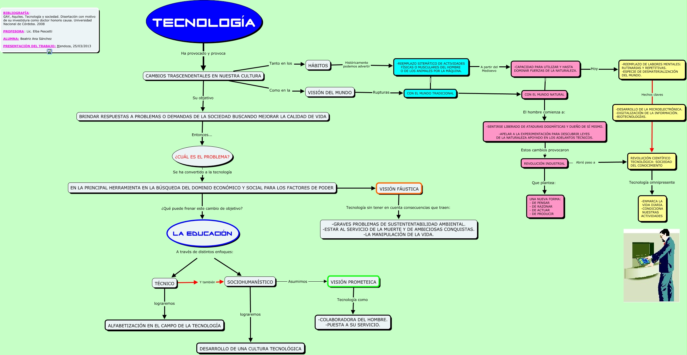 Este Cmap, tiene información relacionada con: Tecnología y sociedad, -SENTIRSE LIBERADO DE ATADURAS DOGMÁTICAS Y DUEÑO DE SÍ MISMO. -APELAR A LA EXPERIMENTACIÓN PARA DESCUBRIR LEYES DE LA NATURALEZA APOYADO EN LOS ADELANTOS TÉCNICOS. Estos cambios provocaron REVOLUCIÓN INDUSTRIAL, SOCIOHUMANÍSTICO Asumimos VISIÓN PROMETEICA, -CAPACIDAD PARA UTILIZAR Y HASTA DOMINAR FUERZAS DE LA NATURALEZA. Hoy -REEMPLAZO DE LABORES MENTALES: RUTINARIAS Y REPETITIVAS. -ESPECIE DE DESMATERIALIZACIÓN DEL MUNDO., LA EDUCACIÓN A través de distintos enfoques: TÉCNICO, REVOLUCIÓN INDUSTRIAL Que plantea: UNA NUEVA FORMA: - DE PENSAR - DE RAZONAR - DE ACTUAR - DE PRODUCIR, VISIÓN DEL MUNDO Rupturas CON EL MUNDO TRADICIONAL, REVOLUCIÓN CIENTÍFICO TECNOLÓGICA: SOCIEDAD DEL CONOCIMIENTO Tecnología omnipresente -ENMARCA LA VIDA DIARIA. -CONDICIONA NUESTRAS ACTIVIDADES, ???? ???? REVOLUCIÓN CIENTÍFICO TECNOLÓGICA: SOCIEDAD DEL CONOCIMIENTO, LA EDUCACIÓN A través de distintos enfoques: SOCIOHUMANÍSTICO, -REEMPLAZO SITEMÁTICO DE ACTIVIDADES FÍSICAS O MUSCULARES DEL HOMBRE O DE LOS ANIMALES POR LA MÁQUINA. A partir del Medioevo -CAPACIDAD PARA UTILIZAR Y HASTA DOMINAR FUERZAS DE LA NATURALEZA., SOCIOHUMANÍSTICO lograremos DESARROLLO DE UNA CULTURA TECNOLÓGICA, -REEMPLAZO SITEMÁTICO DE ACTIVIDADES FÍSICAS O MUSCULARES DEL HOMBRE O DE LOS ANIMALES POR LA MÁQUINA. CON EL MUNDO TRADICIONAL, -CAPACIDAD PARA UTILIZAR Y HASTA DOMINAR FUERZAS DE LA NATURALEZA. ????, HÁBITOS Históricamente podemos advertir -REEMPLAZO SITEMÁTICO DE ACTIVIDADES FÍSICAS O MUSCULARES DEL HOMBRE O DE LOS ANIMALES POR LA MÁQUINA., EN LA PRINCIPAL HERRAMIENTA EN LA BÚSQUEDA DEL DOMINIO ECONÓMICO Y SOCIAL PARA LOS FACTORES DE PODER ¿Qué puede frenar este cambio de objetivo? LA EDUCACIÓN, CON EL MUNDO TRADICIONAL ???? CON EL MUNDO NATURAL, TÉCNICO Y también SOCIOHUMANÍSTICO, CAMBIOS TRASCENDENTALES EN NUESTRA CULTURA Como en la VISIÓN DEL MUNDO, BRINDAR RESPUESTAS A PROBLEMAS O DEMANDAS DE LA SOCIEDAD BUSCANDO MEJORAR LA CALIDAD DE VIDA Entonces... ¿CUÁL ES EL PROBLEMA?, TÉCNICO lograremos ALFABETIZACIÓN EN EL CAMPO DE LA TECNOLOGÍA