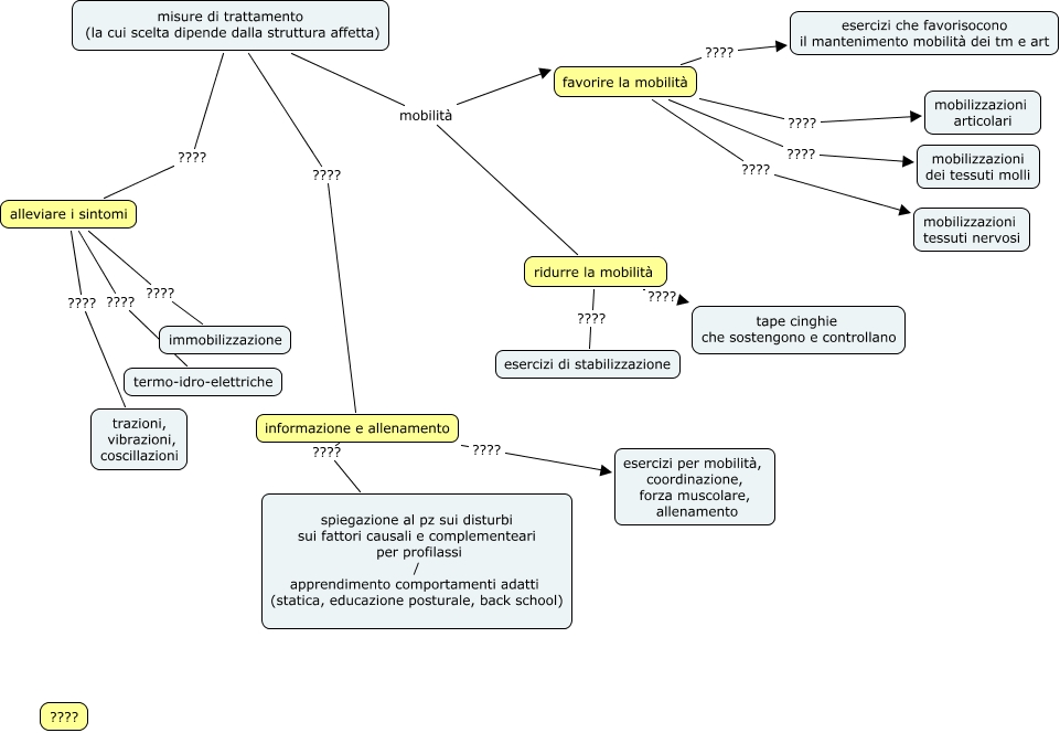 Questa Cmap, creata con IHMC CmapTools, contiene informazioni relative a: terapia manuale kaltenborn terapie per obbiettivi, informazione e allenamento ???? spiegazione al pz sui disturbi sui fattori causali e complementeari per profilassi / apprendimento comportamenti adatti (statica, educazione posturale, back school), misure di trattamento (la cui scelta dipende dalla struttura affetta) ???? alleviare i sintomi, favorire la mobilità ???? mobilizzazioni articolari, alleviare i sintomi ???? termo-idro-elettriche, misure di trattamento (la cui scelta dipende dalla struttura affetta) ???? informazione e allenamento, informazione e allenamento ???? esercizi per mobilità, coordinazione, forza muscolare, allenamento, alleviare i sintomi ???? trazioni, vibrazioni, coscillazioni, alleviare i sintomi ???? immobilizzazione, favorire la mobilità ???? mobilizzazioni dei tessuti molli, misure di trattamento (la cui scelta dipende dalla struttura affetta) mobilità favorire la mobilità, ridurre la mobilità ???? tape cinghie che sostengono e controllano, favorire la mobilità ???? mobilizzazioni tessuti nervosi, misure di trattamento (la cui scelta dipende dalla struttura affetta) mobilità ridurre la mobilità, ridurre la mobilità ???? esercizi di stabilizzazione, favorire la mobilità ???? esercizi che favorisocono il mantenimento mobilità dei tm e art