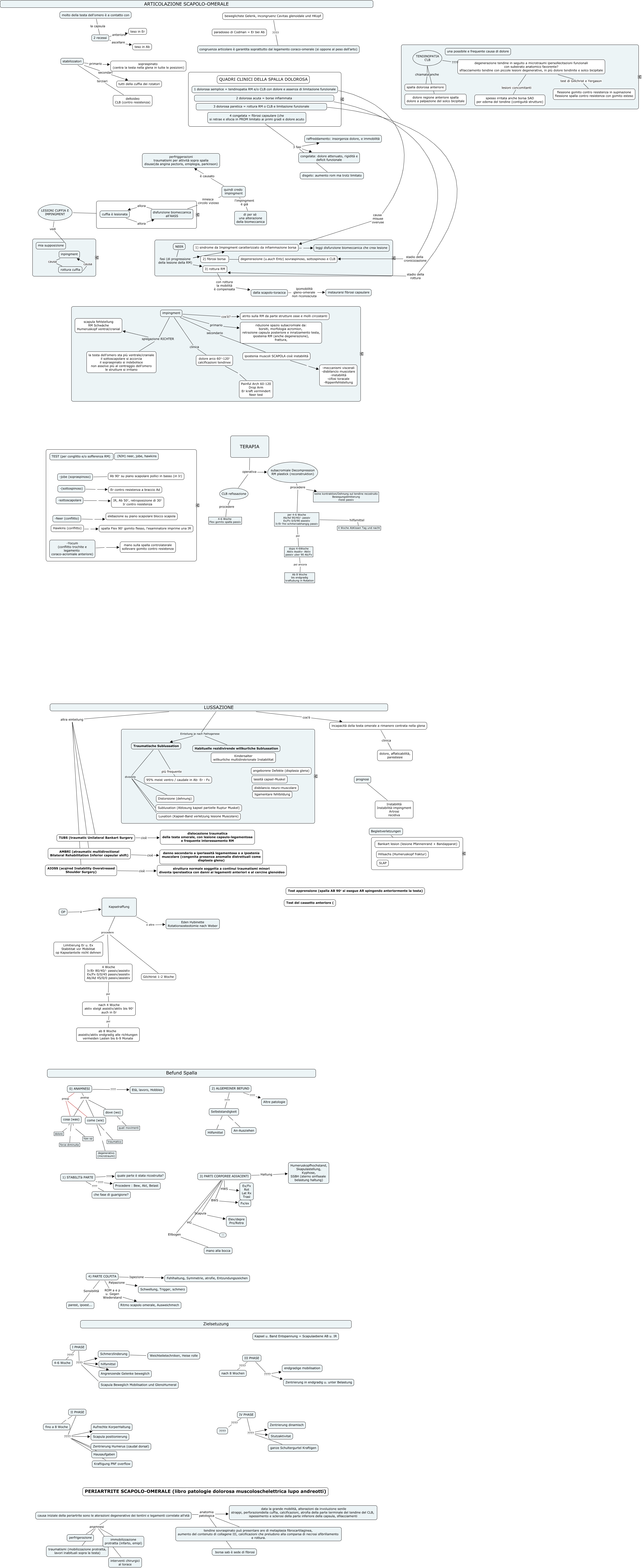 Questa Cmap, creata con IHMC CmapTools, contiene informazioni relative a: Richter scapolo omerale, IV PHASE ???? Stutzaktivitat, per 4-6 Woche Ab/Ad 90/40/- passiv Ex/Fx 0/0/90 assistiv Ir/Er frei schmerzabhangig passiv hilfsmittel 4 Woche AbKissen Tag und nacht, 0) ANAMNESI postop come (wie), NEER fasi (di progressione della lesione della RM) 3) rottura RM, TENDINOPATIA CLB ???? degenerazione tendine in seguito a microtraumi ipersollecitazioni funzionali con substrato anatomico favorente? sfilacciamento tendine con piccole lesioni degenerative, in più dolore tendinite e solco bicipitale, III PHASE ???? nach 8 Wochen, I PHASE ???? Scapula Beweglich Mobilisation und GlenoHumeral, 4 congelata = fibrosi capsulare (che si retrae e sfocia in PROM limitato ai primi gradi e dolore acuto 3 fasi disgelo: aumento rom ma trotz limitato, 2) ALGEMEINER BEFUND ???? Selbststandigkeit, LESIONI CUFFIA E IMPINGMENT ???? ????, IV PHASE ???? ????, impingment clinica dolore arco 60°-120° calcificazioni tendinee, LESIONI CUFFIA E IMPINGMENT vedi mia supposizione, causa iniziale della periartrite sono le aterazioni degenerative dei tentini e legamenti correlate all'età anamnesi traumatismi (mobilizzazione protratta, lavori inabituali sopra la testa), nach 4 Woche aktiv steigt assistiv/aktiv bis 90° auch in Er poi ab 8 Woche assistiv/aktiv endgradig alle richtungen vermeiden Lasten bis 6-9 Monate, 0) ANAMNESI postop cosa (was), Kapselraffung e altre Eden Hybinette Rotationsosteotomie nach Weber, 4) PARTE COLPITA ROM a e p u. Gegen Wiederstand Ritmo scapolo omerale, Ausweichmech, -sottoscapolare IR, Ab 50°, retroposizione di 30° Ir contro resistenza, LUSSAZIONE altra einteilung TUBS (traumatic Unilateral Bankart Surgery