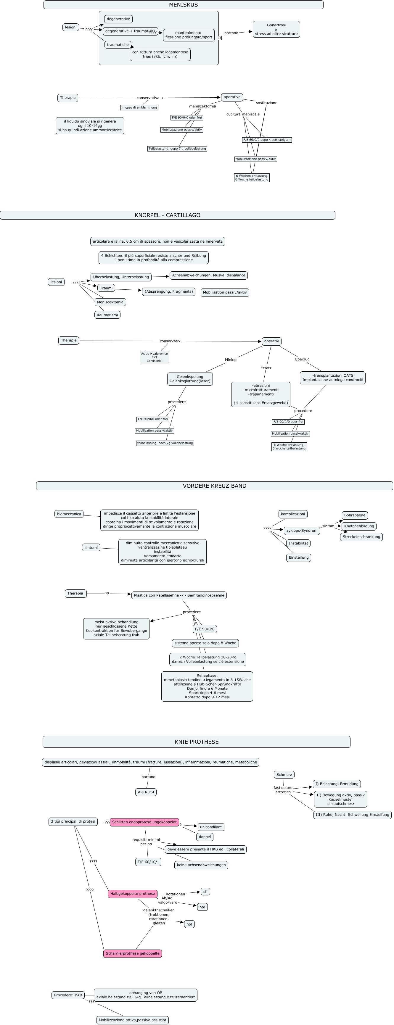 Questa Cmap, creata con IHMC CmapTools, contiene informazioni relative a: Richter Genus menisk, knorp, vkb, prot, Scharnierprothese gekoppelte gelenkthechniken (traktionen, rotationen, gleiten no!, operativa cucitura meniscale Mobilizzazione passiv/aktiv, Plastica con Patellasehne --> Semitendinososehne procedere 2 Woche Teilbelastung 10-20Kg danach Vollebelastung se c'è estensione, Therapia conservativa o operativa, Therapie conservativ operativ, Therapie conservativ Acido Hyaluronico FKT Cortisonici, komplicazioni ???? Einsteifung, Therapia op Plastica con Patellasehne --> Semitendinososehne, Halbgekoppelte prothese Rotationen si!, -transplantazioni OATS Implantazione autologa condrociti procedere 6 Woche entlastung, 6 Woche teilbelastung, Procedere: BAB ???? Mobilizzazione attiva,passiva,assistita, zyklops-Syndrom sintom Knotchenbildung, Gelenkspulung Gelenksglattung(laser) procedere Mobilisation passiv/aktiv, operativa meniscektomia Teilbelastung, dopo 7 g vollebelastung, lesioni ???? traumatiche, lesioni ???? Meniscektomia, operativa sostituzione 6 Wochen entlastung 6 Woche teilbelastung, operativa sostituzione F/E 60/0/0 dopo 4 sett steigern, Therapia conservativa o in caso di einklemmung, traumatiche ???? con rottura anche legamentose trias (vkb, lcm, im)