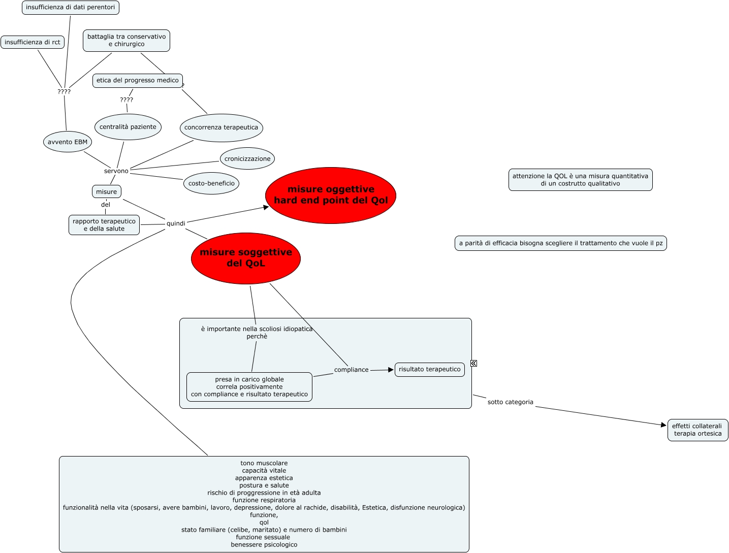 Questa Cmap, creata con IHMC CmapTools, contiene informazioni relative a: Tesi su tesi Background2, misure soggettive del QoL è importante nella scoliosi idiopatica perchè presa in carico globale correla positivamente con compliance e risultato terapeutico, costo-beneficio servono misure, misure soggettive del QoL compliance risultato terapeutico, misure quindi tono muscolare capacità vitale apparenza estetica postura e salute rischio di proggressione in età adulta funzione respiratoria funzionalità nella vita (sposarsi, avere bambini, lavoro, depressione, dolore al rachide, disabilità, Estetica, disfunzione neurologica) funzione, qol stato familiare (celibe, maritato) e numero di bambini funzione sessuale benessere psicologico, avvento EBM servono misure, concorrenza terapeutica servono misure, battaglia tra conservativo e chirurgico ???? avvento EBM, ???? sotto categoria effetti collaterali terapia ortesica, insufficienza di dati perentori ???? avvento EBM, insufficienza di rct ???? avvento EBM, centralità paziente servono misure, cronicizzazione servono misure, rapporto terapeutico e della salute quindi tono muscolare capacità vitale apparenza estetica postura e salute rischio di proggressione in età adulta funzione respiratoria funzionalità nella vita (sposarsi, avere bambini, lavoro, depressione, dolore al rachide, disabilità, Estetica, disfunzione neurologica) funzione, qol stato familiare (celibe, maritato) e numero di bambini funzione sessuale benessere psicologico, misure quindi misure soggettive del QoL, rapporto terapeutico e della salute quindi misure soggettive del QoL, misure del rapporto terapeutico e della salute, rapporto terapeutico e della salute quindi misure oggettive hard end point del Qol, presa in carico globale correla positivamente con compliance e risultato terapeutico compliance risultato terapeutico, battaglia tra conservativo e chirurgico ???? concorrenza terapeutica, misure quindi misure oggettive hard end point del Qol