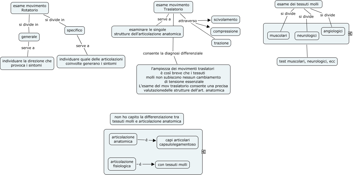 Questa Cmap, creata con IHMC CmapTools, contiene informazioni relative a: terapia manuale 2 tecniche d'esame articolare, esame dei tessuti molli si divide neurologici, specifico serve a individuare quale delle articolazioni coinvolte generano i sintomi, esame movimento Rotatorio si divide in generale, ???? attraverso test muscolari, neurologici, ecc, generale serve a individuare la direzione che provoca i sintomi, esame movimento Traslatorio attraverso compressione, esame movimento Traslatorio serve a esaminare le singole strutture dell'articolazione anatomica, articolazione fisiologica é con tessuti molli, esame movimento Traslatorio attraverso trazione, esame dei tessuti molli si divide angiologici, articolazione anatomica é capi articolari capsulolegamentoso, esame dei tessuti molli si divide muscolari, esame movimento Traslatorio attraverso scivolamento, esame movimento Rotatorio si divide in specifico, esame movimento Traslatorio consente la diagnosi differenziale l'ampiezza dei movimenti traslatori è così breve che i tessuti molli non subiscono nessun cambiamento di tensione essenziale L'esame del mov traslatorio consente una precisa valutazionedelle strutture dell'art. anatomica