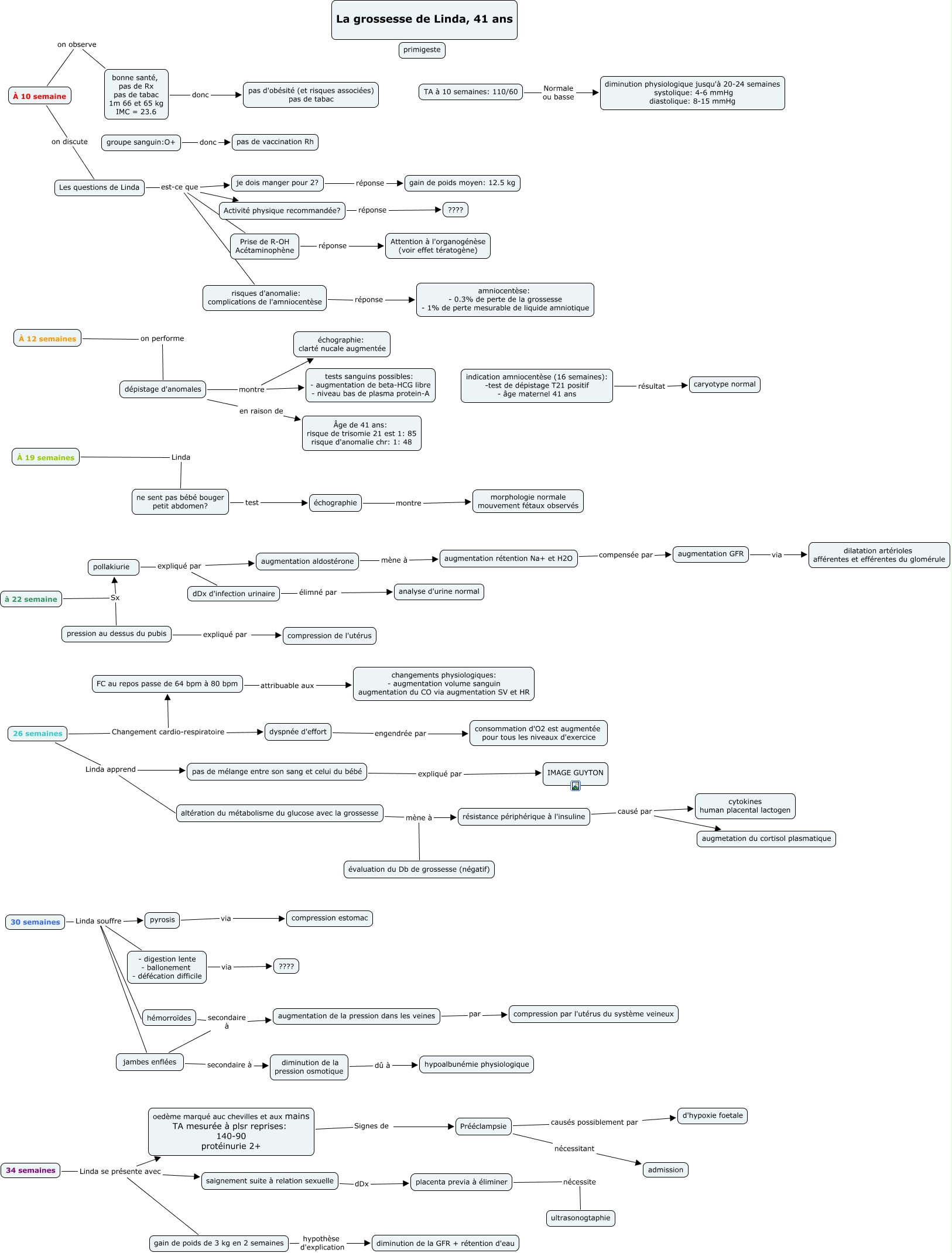Cette carte de concepts créée avec IHMC CmapTools traite de: APP9 aller, Les questions de Linda est-ce que Prise de R-OH Acétaminophène, Activité physique recommandée? réponse ????, À 10 semaine on observe bonne santé, pas de Rx pas de tabac 1m 66 et 65 kg IMC = 23.6, Prise de R-OH Acétaminophène réponse Attention à l'organogénèse (voir effet tératogène), Prééclampsie causés possiblement par d'hypoxie foetale, dDx d'infection urinaire élimné par analyse d'urine normal, placenta previa à éliminer nécessite ultrasonogtaphie, altération du métabolisme du glucose avec la grossesse mène à évaluation du Db de grossesse (négatif), hémorroïdes secondaire à augmentation de la pression dans les veines, dépistage d'anomales montre échographie: clarté nucale augmentée, 26 semaines Changement cardio-respiratoire FC au repos passe de 64 bpm à 80 bpm, ne sent pas bébé bouger petit abdomen? test échographie, 34 semaines Linda se présente avec gain de poids de 3 kg en 2 semaines, 26 semaines Linda apprend pas de mélange entre son sang et celui du bébé, À 10 semaine on discute Les questions de Linda, dépistage d'anomales en raison de Âge de 41 ans: risque de trisomie 21 est 1: 85 risque d'anomalie chr: 1: 48, Prééclampsie nécessitant admission, pression au dessus du pubis expliqué par compression de l'utérus, pas de mélange entre son sang et celui du bébé expliqué par IMAGE GUYTON, à 22 semaine Sx pression au dessus du pubis
