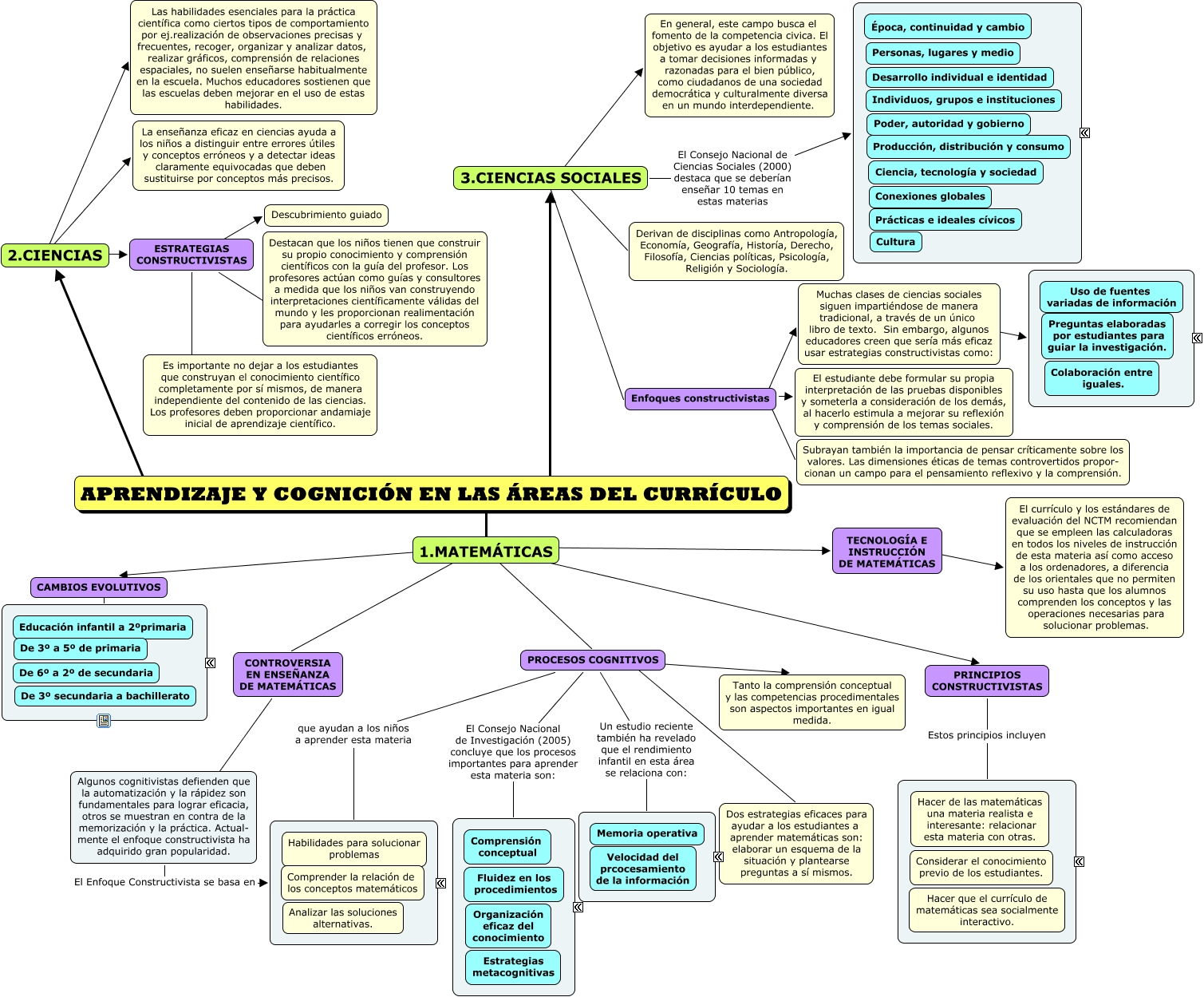 Este Cmap, tiene información relacionada con: MAPA_RESUMEN_PSICOLOGIA_EDUCACION_7.2, CONTROVERSIA EN ENSEÑANZA DE MATEMÁTICAS ???? Algunos cognitivistas defienden que la automatización y la rápidez son fundamentales para lograr eficacia, otros se muestran en contra de la memorización y la práctica. Actual- mente el enfoque constructivista ha adquirido gran popularidad., PROCESOS COGNITIVOS ???? Dos estrategias eficaces para ayudar a los estudiantes a aprender matemáticas son: elaborar un esquema de la situación y plantearse preguntas a sí mismos., Enfoques constructivistas ???? El estudiante debe formular su propia interpretación de las pruebas disponibles y someterla a consideración de los demás, al hacerlo estimula a mejorar su reflexión y comprensión de los temas sociales., CAMBIOS EVOLUTIVOS ???? ????, 3.CIENCIAS SOCIALES El Consejo Nacional de Ciencias Sociales (2000) destaca que se deberían enseñar 10 temas en estas materias ????, 1.MATEMÁTICAS ???? TECNOLOGÍA E INSTRUCCIÓN DE MATEMÁTICAS, 2.CIENCIAS ???? La enseñanza eficaz en ciencias ayuda a los niños a distinguir entre errores útiles y conceptos erróneos y a detectar ideas claramente equivocadas que deben sustituirse por conceptos más precisos., 3.CIENCIAS SOCIALES ???? Derivan de disciplinas como Antropología, Economía, Geografía, Historía, Derecho, Filosofía, Ciencias políticas, Psicología, Religión y Sociología., APRENDIZAJE Y COGNICIÓN EN LAS ÁREAS DEL CURRÍCULO ???? 1.MATEMÁTICAS, 3.CIENCIAS SOCIALES ???? En general, este campo busca el fomento de la competencia civica. El objetivo es ayudar a los estudiantes a tomar decisiones informadas y razonadas para el bien público, como ciudadanos de una sociedad democrática y culturalmente diversa en un mundo interdependiente., Algunos cognitivistas defienden que la automatización y la rápidez son fundamentales para lograr eficacia, otros se muestran en contra de la memorización y la práctica. Actual- mente el enfoque constructivista ha adquirido gran popularidad. El Enfoque Constructivista se basa en ????, ESTRATEGIAS CONSTRUCTIVISTAS ???? Destacan que los niños tienen que construir su propio conocimiento y comprensión científicos con la guía del profesor. Los profesores actúan como guías y consultores a medida que los niños van construyendo interpretaciones científicamente válidas del mundo y les proporcionan realimentación para ayudarles a corregir los conceptos científicos erróneos., PROCESOS COGNITIVOS Un estudio reciente también ha revelado que el rendimiento infantil en esta área se relaciona con: ????, 1.MATEMÁTICAS ???? CAMBIOS EVOLUTIVOS, 2.CIENCIAS ???? ESTRATEGIAS CONSTRUCTIVISTAS, 1.MATEMÁTICAS ???? PROCESOS COGNITIVOS, PRINCIPIOS CONSTRUCTIVISTAS Estos principios incluyen ????, 1.MATEMÁTICAS ???? PRINCIPIOS CONSTRUCTIVISTAS, APRENDIZAJE Y COGNICIÓN EN LAS ÁREAS DEL CURRÍCULO ???? 3.CIENCIAS SOCIALES, PROCESOS COGNITIVOS ???? Tanto la comprensión conceptual y las competencias procedimentales son aspectos importantes en igual medida.