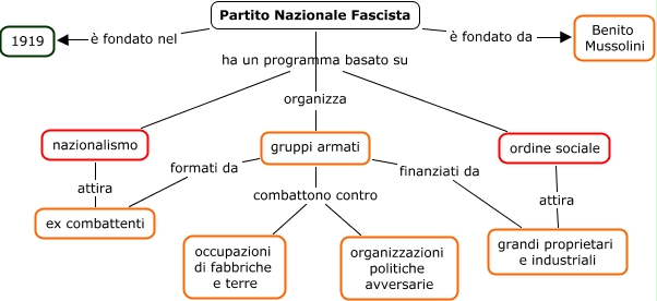Questa Cmap, creata con IHMC CmapTools, contiene informazioni relative a: 341) Partito nazionale fascista, Partito Nazionale Fascista ha un programma basato su nazionalismo, gruppi armati formati da ex combattenti, Partito Nazionale Fascista è fondato nel 1919, gruppi armati combattono contro occupazioni di fabbriche e terre, gruppi armati combattono contro organizzazioni politiche avversarie, Partito Nazionale Fascista è fondato da Benito Mussolini, Partito Nazionale Fascista organizza gruppi armati, nazionalismo attira ex combattenti, ordine sociale attira grandi proprietari e industriali, Partito Nazionale Fascista ha un programma basato su ordine sociale, gruppi armati finanziati da grandi proprietari e industriali