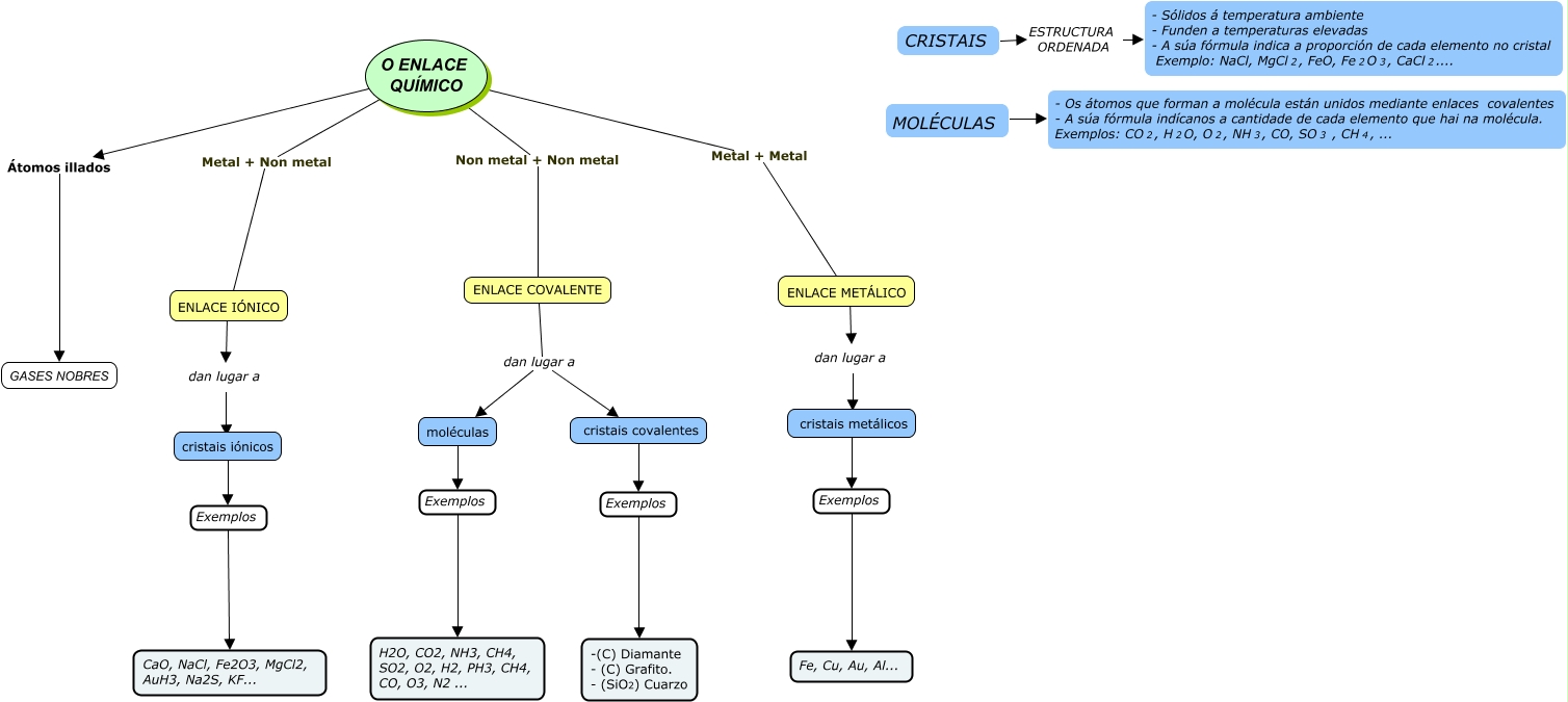 Este mapa conceptual ten información relativa a: enlace3eso, dan lugar a ???? cristais metálicos, cristais iónicos Exemplos CaO, NaCl, Fe2O3, MgCl2, AuH3, Na2S, KF..., cristais covalentes Exemplos -(C) Diamante - (C) Grafito. - (SiO2) Cuarzo, ENLACE METÁLICO ???? dan lugar a, moléculas Exemplos H2O, CO2, NH3, CH4, SO2, O2, H2, PH3, CH4, CO, O3, N2 ..., ENLACE COVALENTE dan lugar a moléculas, cristais metálicos Exemplos Fe, Cu, Au, Al..., O ENLACE QUÍMICO Non metal + Non metal ENLACE COVALENTE, MOLÉCULAS ???? - Os átomos que forman a molécula están unidos mediante enlaces covalentes - A súa fórmula indícanos a cantidade de cada elemento que hai na molécula. Exemplos: CO2, H2O, O2, NH3, CO, SO3 , CH4, ..., O ENLACE QUÍMICO Metal + Metal ENLACE METÁLICO, dan lugar a ???? cristais iónicos, O ENLACE QUÍMICO Átomos illados GASES NOBRES, CRISTAIS ESTRUCTURA ORDENADA - Sólidos á temperatura ambiente - Funden a temperaturas elevadas - A súa fórmula indica a proporción de cada elemento no cristal Exemplo: NaCl, MgCl2, FeO, Fe2O3, CaCl2...., O ENLACE QUÍMICO Metal + Non metal ENLACE IÓNICO, ENLACE IÓNICO ???? dan lugar a, ENLACE COVALENTE dan lugar a cristais covalentes