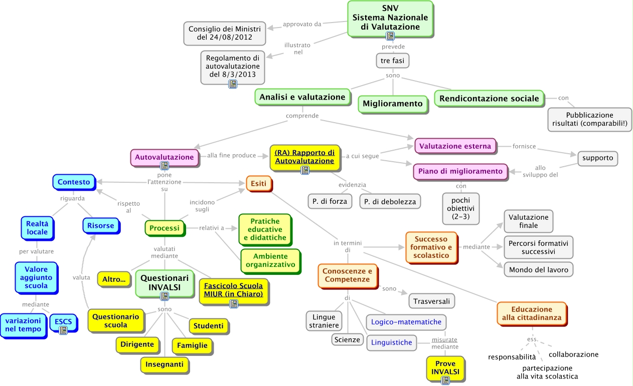Questa Cmap, creata con IHMC CmapTools, contiene informazioni relative a: SNV, (RA) Rapporto di Autovalutazione evidenzia P. di debolezza, Linguistiche misurate mediante Prove INVALSI, Successo formativo e scolastico mediante Valutazione finale, Educazione alla cittadinanza ess. collaborazione, Esiti in termini di Educazione alla cittadinanza, Questionari INVALSI sono Questionario scuola, Questionari INVALSI sono Dirigente, tre fasi sono Miglioramento, Conoscenze e Competenze di Linguistiche, Processi valutati mediante Fascicolo Scuola MIUR (in Chiaro), Processi incidono sugli Esiti, Educazione alla cittadinanza ess. partecipazione alla vita scolastica, Successo formativo e scolastico mediante Percorsi formativi successivi, Conoscenze e Competenze di Lingue straniere, Educazione alla cittadinanza ess. responsabilità, Questionario scuola valuta Risorse, Valutazione esterna fornisce supporto, Autovalutazione alla fine produce (RA) Rapporto di Autovalutazione, Processi rispetto al Contesto, (RA) Rapporto di Autovalutazione a cui segue Valutazione esterna