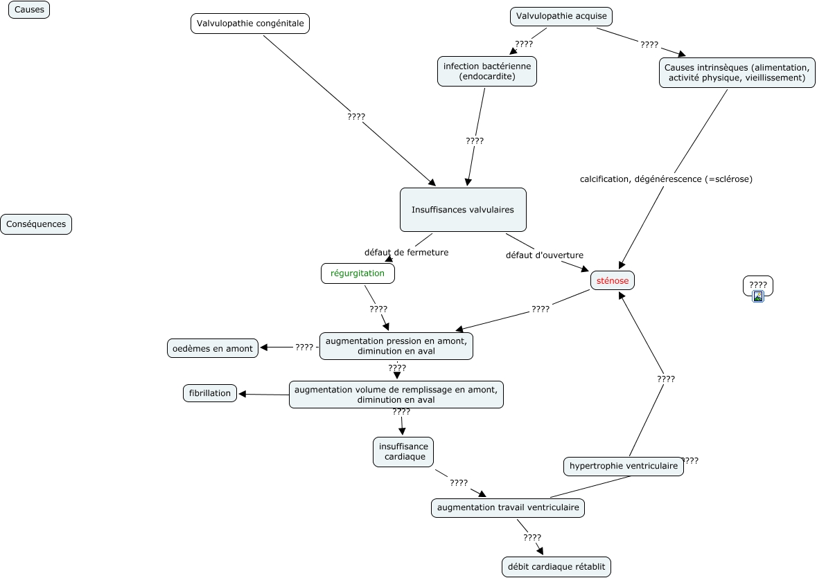 Cette carte de concepts créée avec IHMC CmapTools traite de: Insuffisance valvulaire 1, augmentation volume de remplissage en amont, diminution en aval ???? insuffisance cardiaque, augmentation pression en amont, diminution en aval ???? augmentation volume de remplissage en amont, diminution en aval, Insuffisances valvulaires défaut d'ouverture sténose, augmentation travail ventriculaire ???? débit cardiaque rétablit, Causes intrinsèques (alimentation, activité physique, vieillissement) calcification, dégénérescence (=sclérose) sténose, augmentation travail ventriculaire ???? hypertrophie ventriculaire, hypertrophie ventriculaire ???? sténose, insuffisance cardiaque ???? augmentation travail ventriculaire, sténose ???? augmentation pression en amont, diminution en aval, Valvulopathie acquise ???? infection bactérienne (endocardite), augmentation pression en amont, diminution en aval ???? oedèmes en amont, augmentation volume de remplissage en amont, diminution en aval ???? fibrillation, Valvulopathie congénitale ???? Insuffisances valvulaires, infection bactérienne (endocardite) ???? Insuffisances valvulaires, Valvulopathie acquise ???? Causes intrinsèques (alimentation, activité physique, vieillissement), régurgitation ???? augmentation pression en amont, diminution en aval, Insuffisances valvulaires défaut de fermeture régurgitation