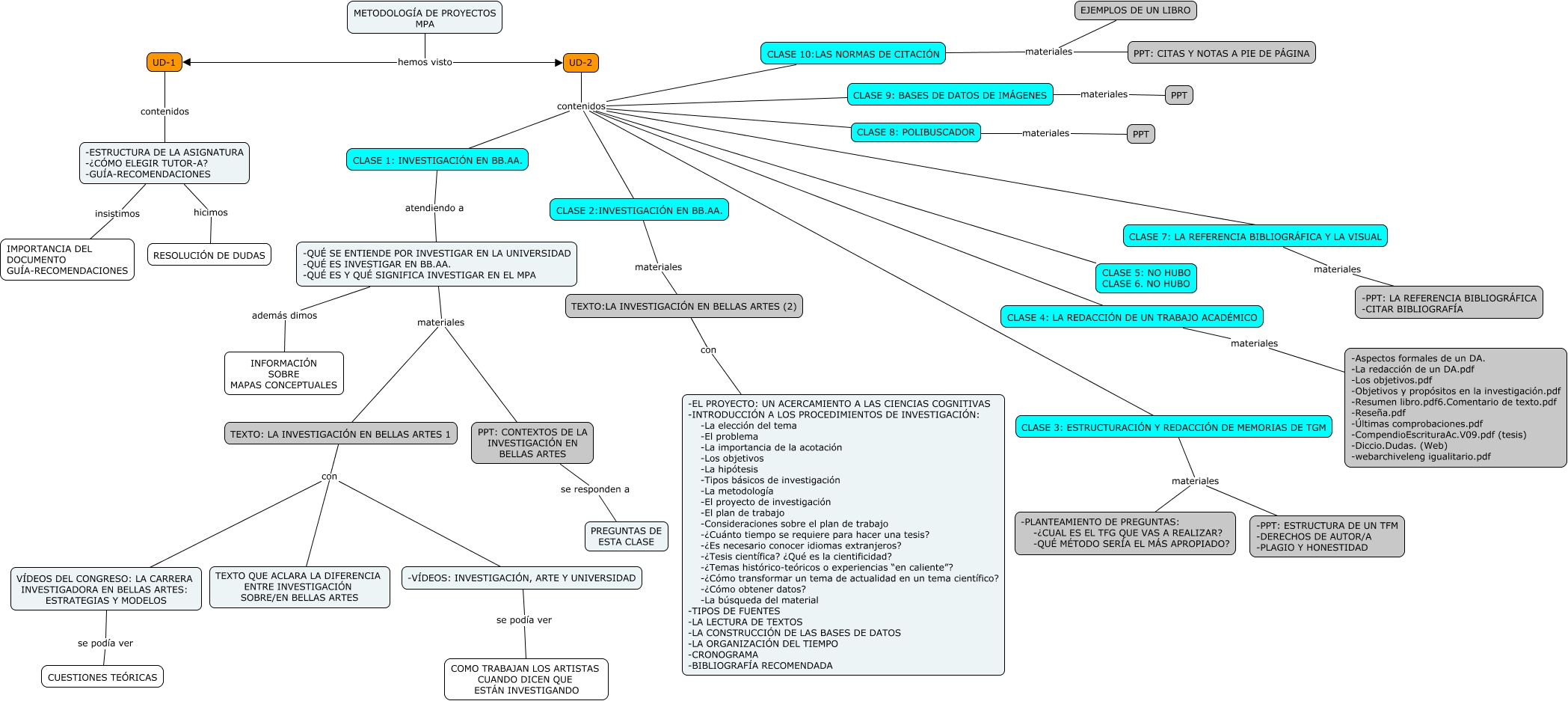Este Cmap, tiene información relacionada con: RESOLUCION DE DUDAS-MPA, -PPT: ESTRUCTURA DE UN TFM -DERECHOS DE AUTOR/A -PLAGIO Y HONESTIDAD materiales -PLANTEAMIENTO DE PREGUNTAS: -¿CUAL ES EL TFG QUE VAS A REALIZAR? -QUÉ MÉTODO SERÍA EL MÁS APROPIADO?, CLASE 1: INVESTIGACIÓN EN BB.AA. contenidos CLASE 3: ESTRUCTURACIÓN Y REDACCIÓN DE MEMORIAS DE TGM, -QUÉ SE ENTIENDE POR INVESTIGAR EN LA UNIVERSIDAD -QUÉ ES INVESTIGAR EN BB.AA. -QUÉ ES Y QUÉ SIGNIFICA INVESTIGAR EN EL MPA además dimos INFORMACIÓN SOBRE MAPAS CONCEPTUALES, CLASE 5: NO HUBO CLASE 6. NO HUBO contenidos CLASE 3: ESTRUCTURACIÓN Y REDACCIÓN DE MEMORIAS DE TGM, METODOLOGÍA DE PROYECTOS MPA hemos visto UD-2, CLASE 1: INVESTIGACIÓN EN BB.AA. contenidos CLASE 4: LA REDACCIÓN DE UN TRABAJO ACADÉMICO, CLASE 10:LAS NORMAS DE CITACIÓN contenidos CLASE 3: ESTRUCTURACIÓN Y REDACCIÓN DE MEMORIAS DE TGM, CLASE 2:INVESTIGACIÓN EN BB.AA. contenidos CLASE 4: LA REDACCIÓN DE UN TRABAJO ACADÉMICO, CLASE 7: LA REFERENCIA BIBLIOGRÁFICA Y LA VISUAL contenidos CLASE 3: ESTRUCTURACIÓN Y REDACCIÓN DE MEMORIAS DE TGM, -VÍDEOS: INVESTIGACIÓN, ARTE Y UNIVERSIDAD se podía ver COMO TRABAJAN LOS ARTISTAS CUANDO DICEN QUE ESTÁN INVESTIGANDO, UD-2 contenidos CLASE 4: LA REDACCIÓN DE UN TRABAJO ACADÉMICO, METODOLOGÍA DE PROYECTOS MPA hemos visto UD-1, VÍDEOS DEL CONGRESO: LA CARRERA INVESTIGADORA EN BELLAS ARTES: ESTRATEGIAS Y MODELOS se podía ver CUESTIONES TEÓRICAS, CLASE 9: BASES DE DATOS DE IMÁGENES contenidos CLASE 4: LA REDACCIÓN DE UN TRABAJO ACADÉMICO, CLASE 2:INVESTIGACIÓN EN BB.AA. contenidos CLASE 3: ESTRUCTURACIÓN Y REDACCIÓN DE MEMORIAS DE TGM, CLASE 7: LA REFERENCIA BIBLIOGRÁFICA Y LA VISUAL contenidos CLASE 4: LA REDACCIÓN DE UN TRABAJO ACADÉMICO, CLASE 10:LAS NORMAS DE CITACIÓN contenidos CLASE 4: LA REDACCIÓN DE UN TRABAJO ACADÉMICO, CLASE 8: POLIBUSCADOR contenidos CLASE 3: ESTRUCTURACIÓN Y REDACCIÓN DE MEMORIAS DE TGM, -VÍDEOS: INVESTIGACIÓN, ARTE Y UNIVERSIDAD con TEXTO QUE ACLARA LA DIFERENCIA ENTRE INVESTIGACIÓN SOBRE/EN BELLAS ARTES, TEXTO:LA INVESTIGACIÓN EN BELLAS ARTES (2) con -EL PROYECTO: UN ACERCAMIENTO A LAS CIENCIAS COGNITIVAS -INTRODUCCIÓN A LOS PROCEDIMIENTOS DE INVESTIGACIÓN: -La elección del tema -El problema -La importancia de la acotación -Los objetivos -La hipótesis -Tipos básicos de investigación -La metodología -El proyecto de investigación -El plan de trabajo -Consideraciones sobre el plan de trabajo -¿Cuánto tiempo se requiere para hacer una tesis? -¿Es necesario conocer idiomas extranjeros? -¿Tesis científica? ¿Qué es la cientificidad? -¿Temas histórico-teóricos o experiencias “en caliente”? -¿Cómo transformar un tema de actualidad en un tema científico? -¿Cómo obtener datos? -La búsqueda del material -TIPOS DE FUENTES -LA LECTURA DE TEXTOS -LA CONSTRUCCIÓN DE LAS BASES DE DATOS -LA ORGANIZACIÓN DEL TIEMPO -CRONOGRAMA -BIBLIOGRAFÍA RECOMENDADA