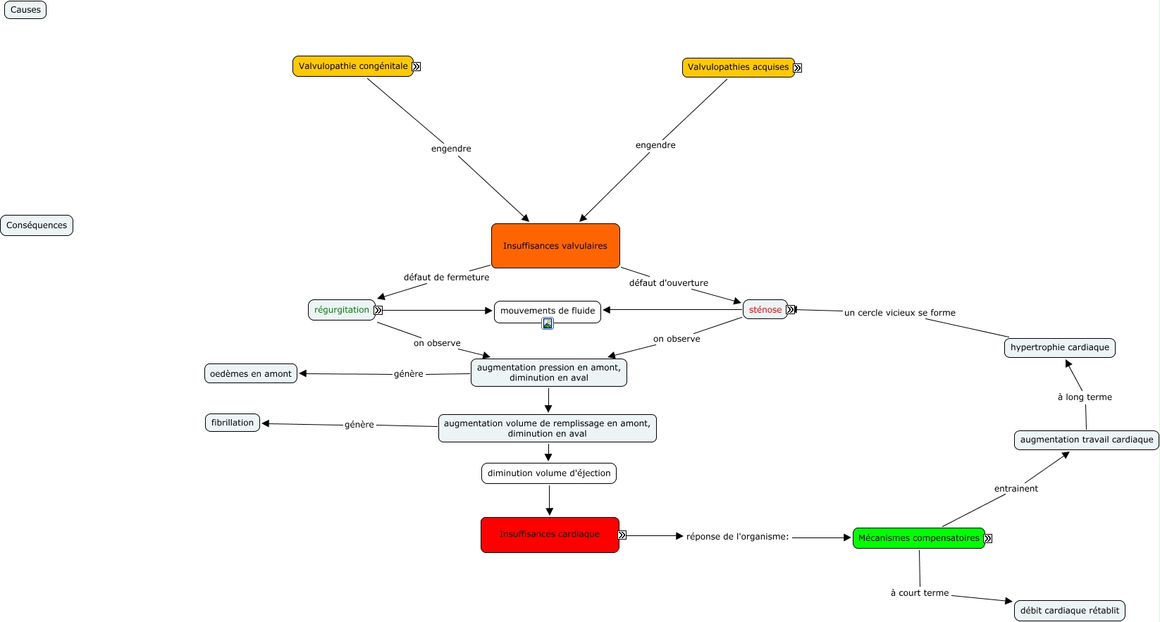 Cette carte de concepts créée avec IHMC CmapTools traite de: Insuffisance valvulaire 2, SNC qui stimule par voie nerveuse ou via cathécolamines cellules juxtaglomérulaires, Insuffisances valvulaires défaut de fermeture régurgitation, Valvulopathies acquises infection bactérienne (endocardite), besoins physiologiques consommation électrolytes, Causes intrinsèques soit alimentation, augmentation volume de remplissage en amont, diminution en aval diminution volume d'éjection, diminution volume d'éjection Insuffisances cardiaque, cathécolamines qui agissent via cellules pacemaker, Insuffisances valvulaires défaut d'ouverture sténose, rhumatisme articulaire aigu causé par infection des voies respiratoires, augmentation pression OG augmentation pression pulmonaire, régurgitation on observe augmentation pression en amont, diminution en aval, régurgitation mouvements de fluide, augmentation pression OG augmentation pression pulmonaire, Valvulopathie congénitale engendre Insuffisances valvulaires, vasopressine (ADH) entraine rétention d'eau, augmentation pression en amont, diminution en aval augmentation volume de remplissage en amont, diminution en aval, cathécolamines qui agissent via toute cellules cardiaques, besoins physiologiques consommation nutriments, cellules pacemaker effet bathmotrope +
